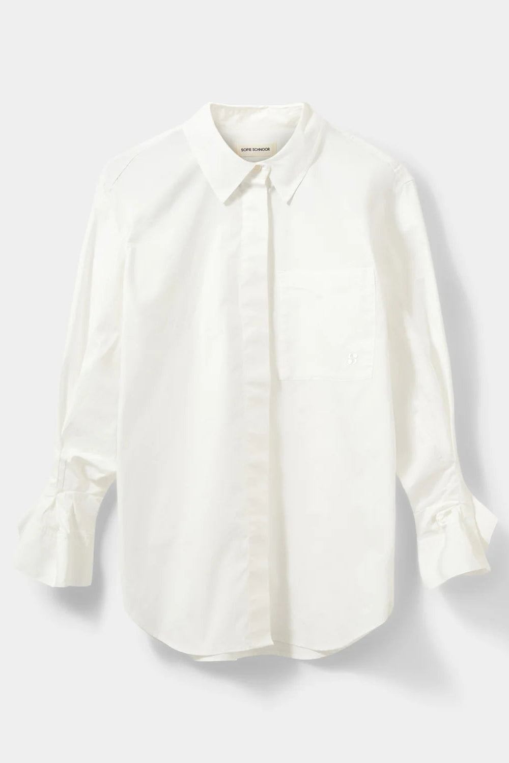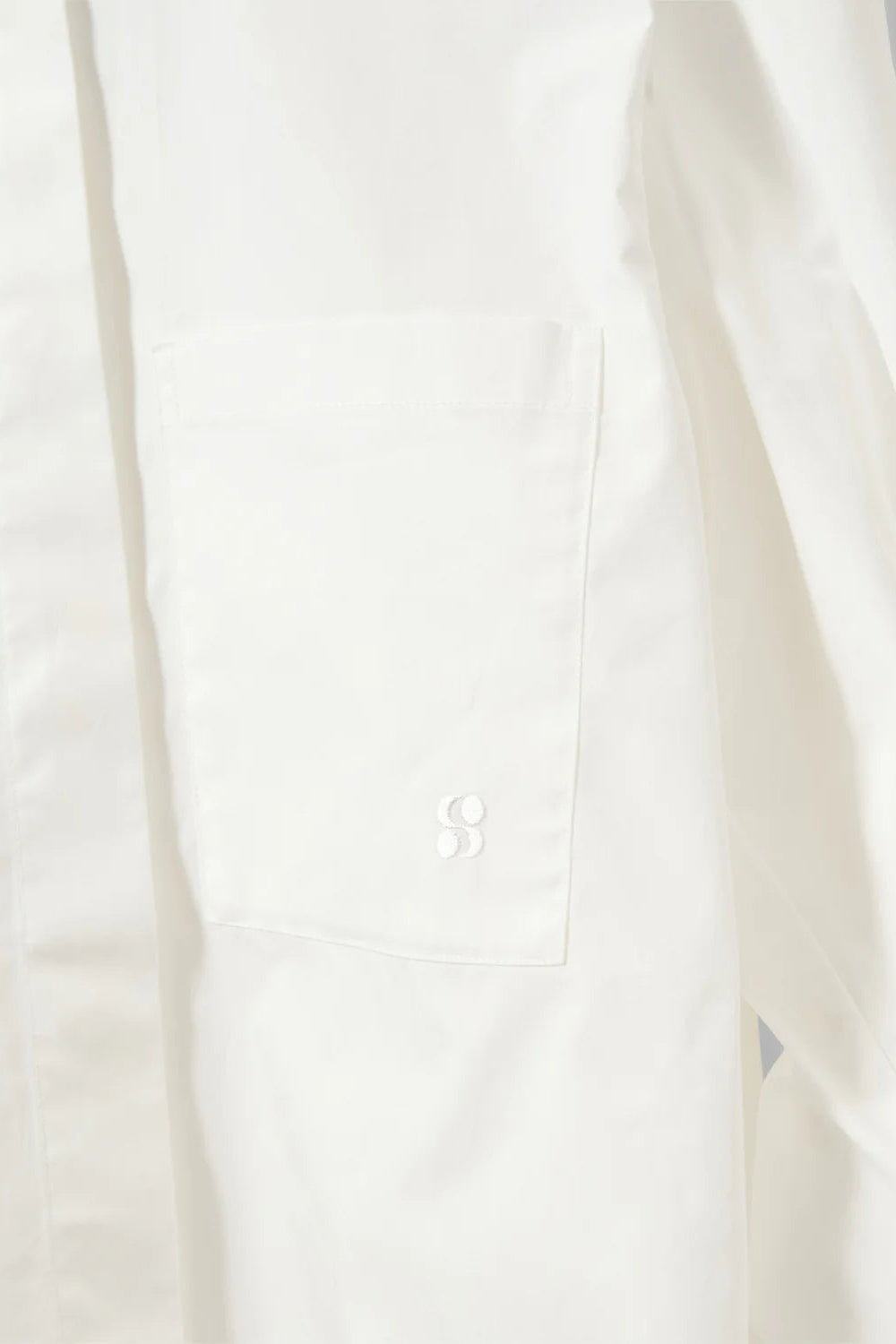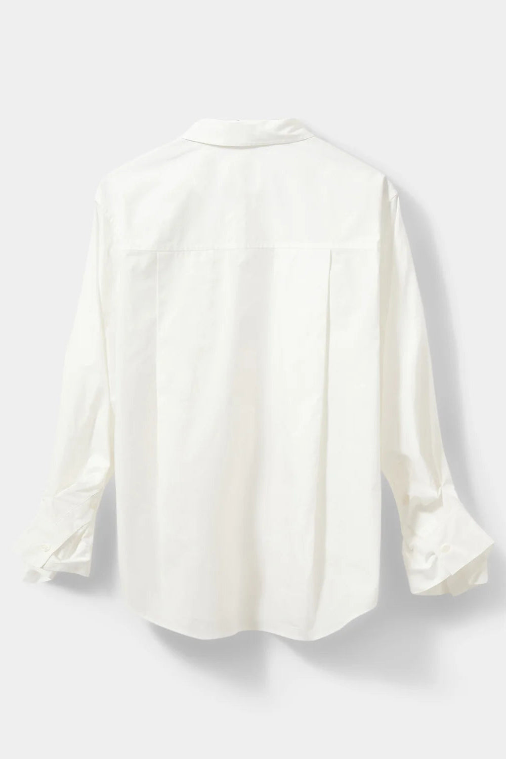 An embroidered logo on the chest pocket introduces a subtle point of identity, while a deep back pleat adds dimension and fluid movement to the silhouette. The long sleeves are finished with considered cuff detailing, reinforcing the shirt’s tailored sensibility while maintaining a relaxed, contemporary ease.
