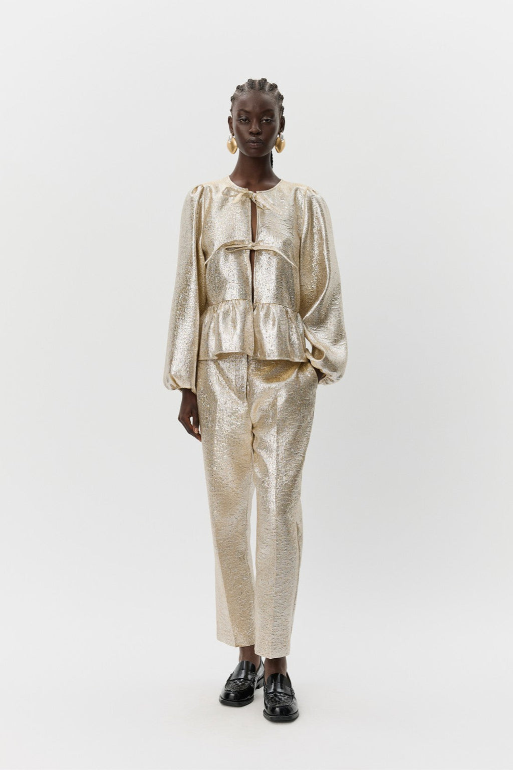 Turn heads with this stunning crushed gold blouse, designed with elegant puff sleeves and a charming bow tie-up front. The luxurious metallic sheen catches the light beautifully, while the feminine silhouette adds a touch of romance to your look. Perfect for evening events, parties, or dressing up a casual outfit, this blouse pairs effortlessly with tailored trousers, skirts, or jeans for a chic, statement-making ensemble.