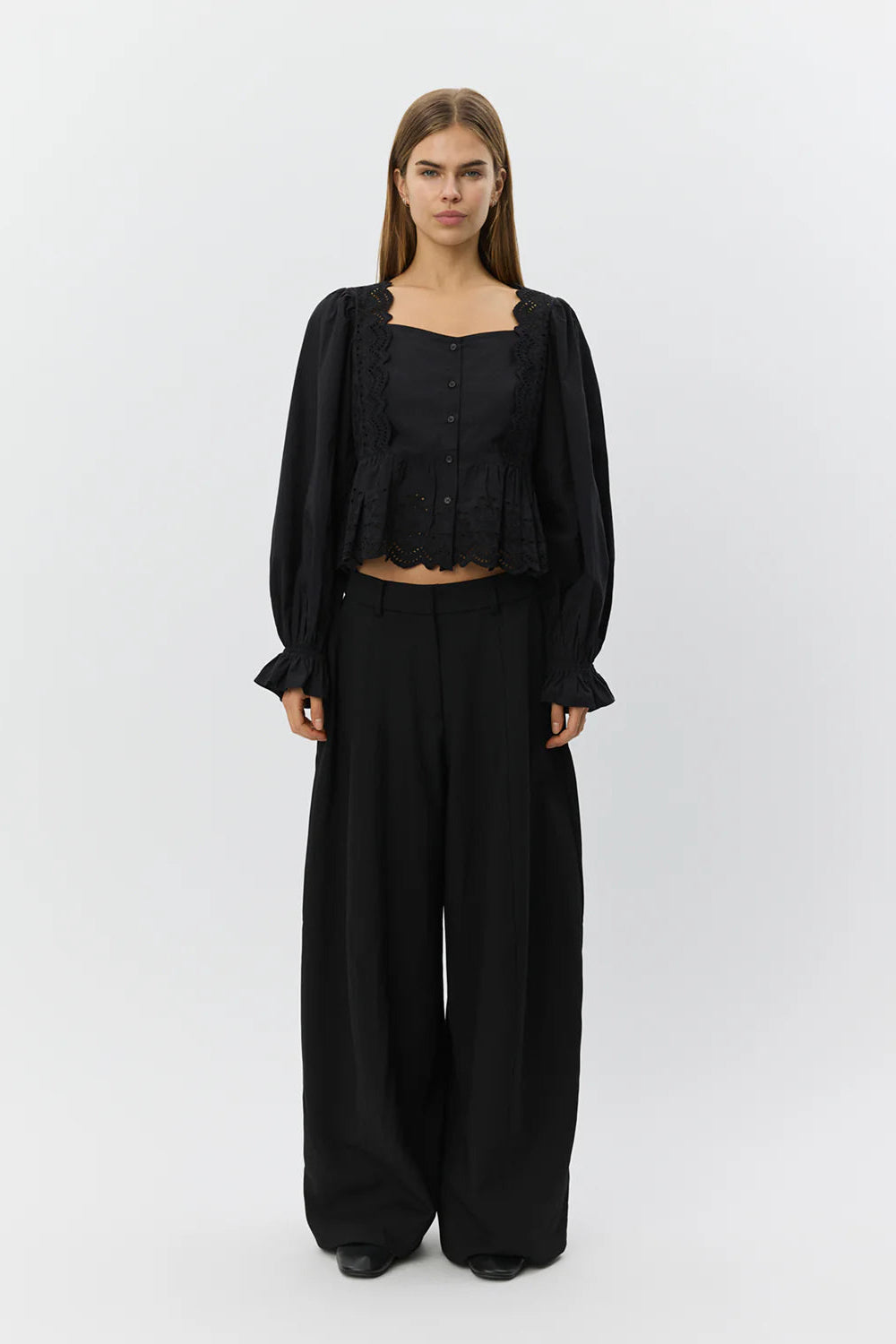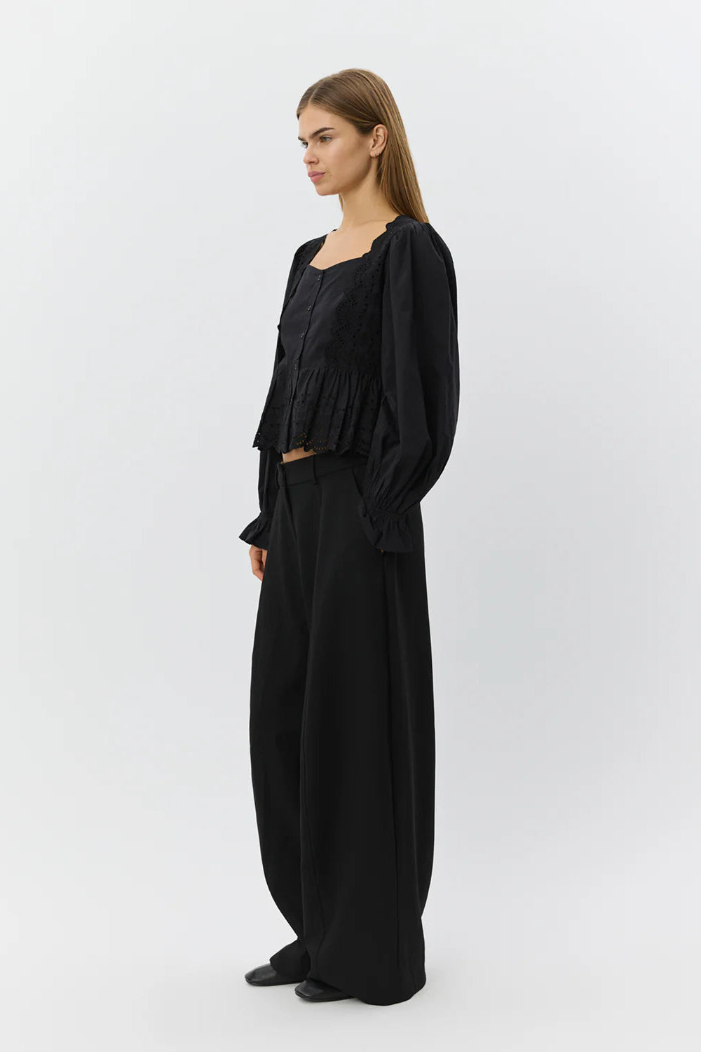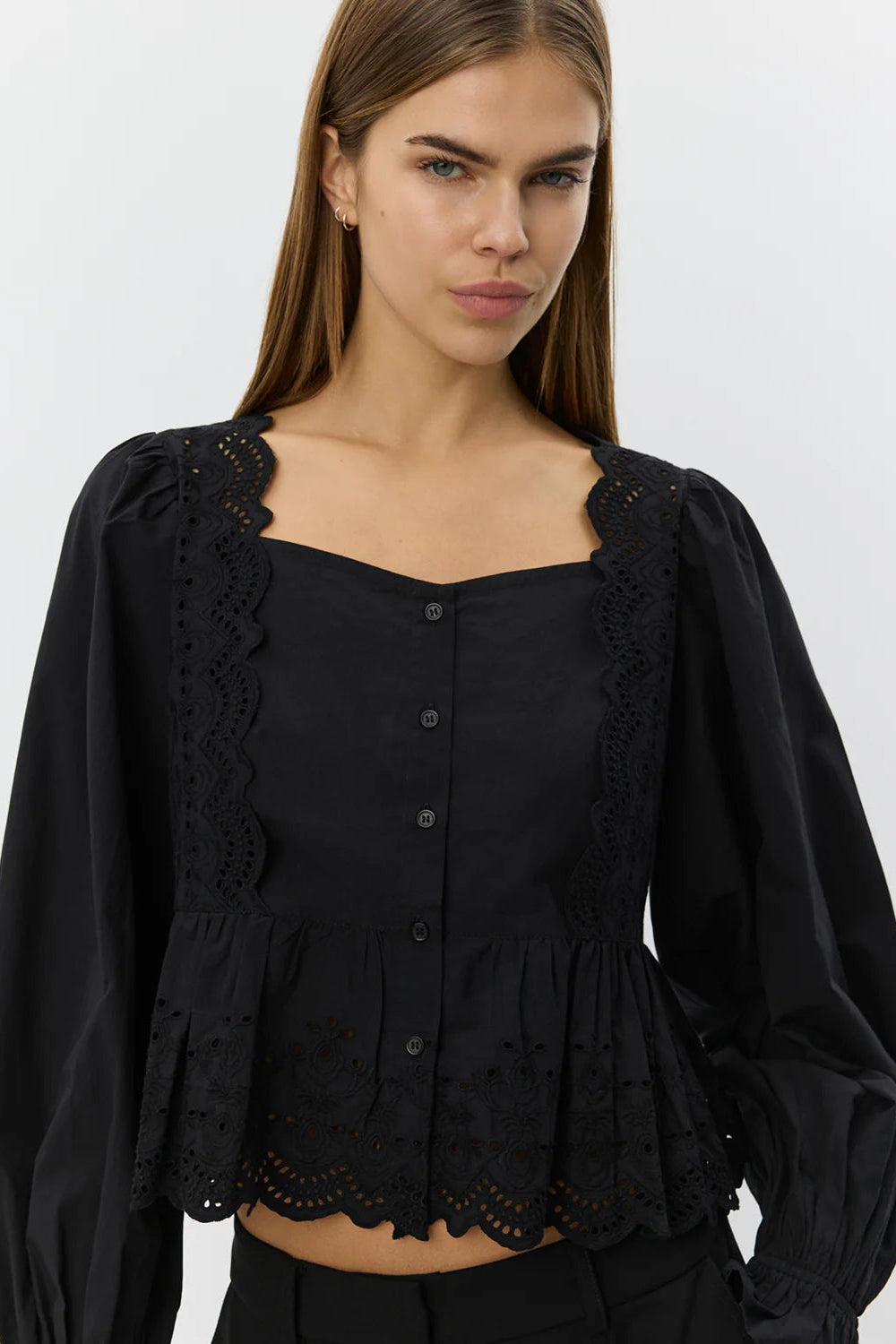 Romantic with a modern edge, this puff sleeve blouse is designed to make a statement through delicate detailing and feminine shape. Featuring a flattering square neckline and lightly puffed shoulders, it creates a soft, structured silhouette. Ruffles along the neckline and button placket add texture and charm, while the peplum hem finished with broderie anglaise brings graceful movement and a vintage-inspired touch. Long sleeves are completed with elasticated cuffs and ruffle detailing for an effortlessly elegant finish.