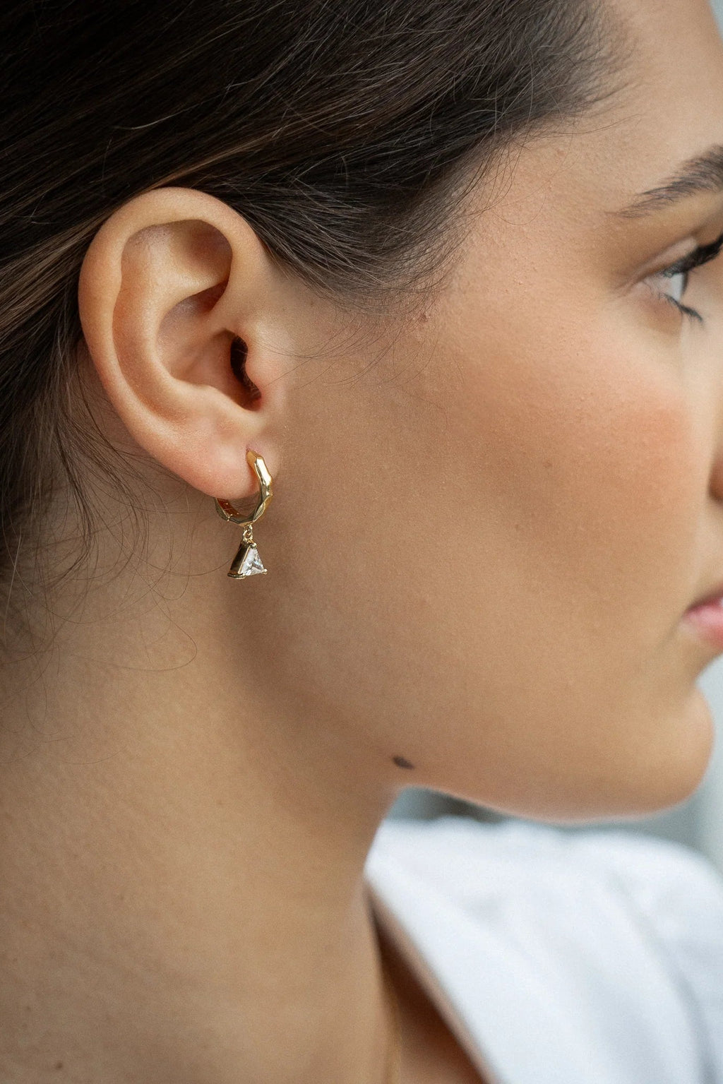 A gorgeous hammered hoop drops into a unique triangular shaped zircon. Simple, classic hoops with a touch of glamour and edge.