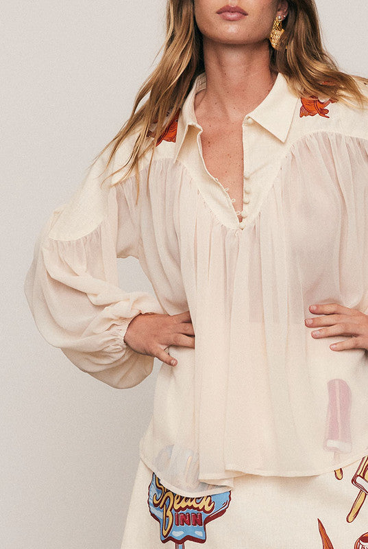 The Carp Blouse is where statement print meets effortless refinement. Cut from airy, semi-sheer crepe, it features a contrasting cotton yoke adorned with Bohemian Traders’ exclusive carp motif—an artful detail that adds depth and character.