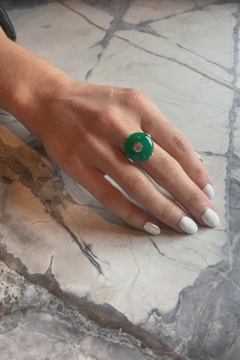 This statement ring draws inspiration from ancient Celtic jewelry, but with a modern and playful twist. The striking design features stunning deep emerald hued green resin and zircon, set in Sterling Silver.