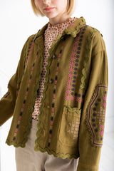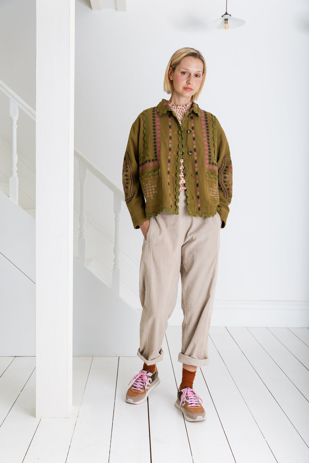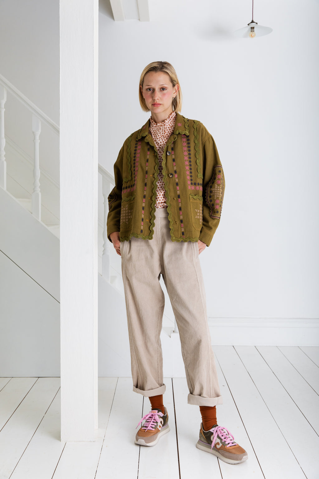 Infuse your wardrobe with artisanal charm in the Genevieve Jacket, a relaxed-fit layer crafted in rich olive cotton. Detailed with intricate pink, navy, and beige embroidery, this piece blends heritage-inspired patterns with contemporary wearability. Wavy scalloped trims trace the collar, front placket, cuffs, and hem, adding playful texture and movement. A button-front closure and patch pockets ensure both function and style, while the lightweight fabric makes it perfect for year-round layering. Pair it with corduroy trousers for a vintage touch or over a floral dress for a fresh contrast.