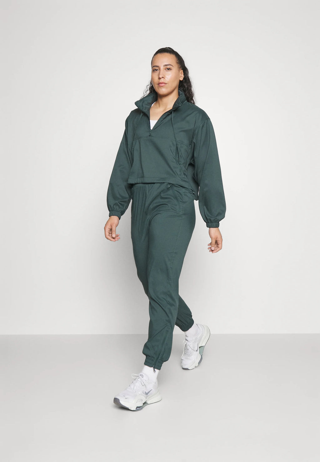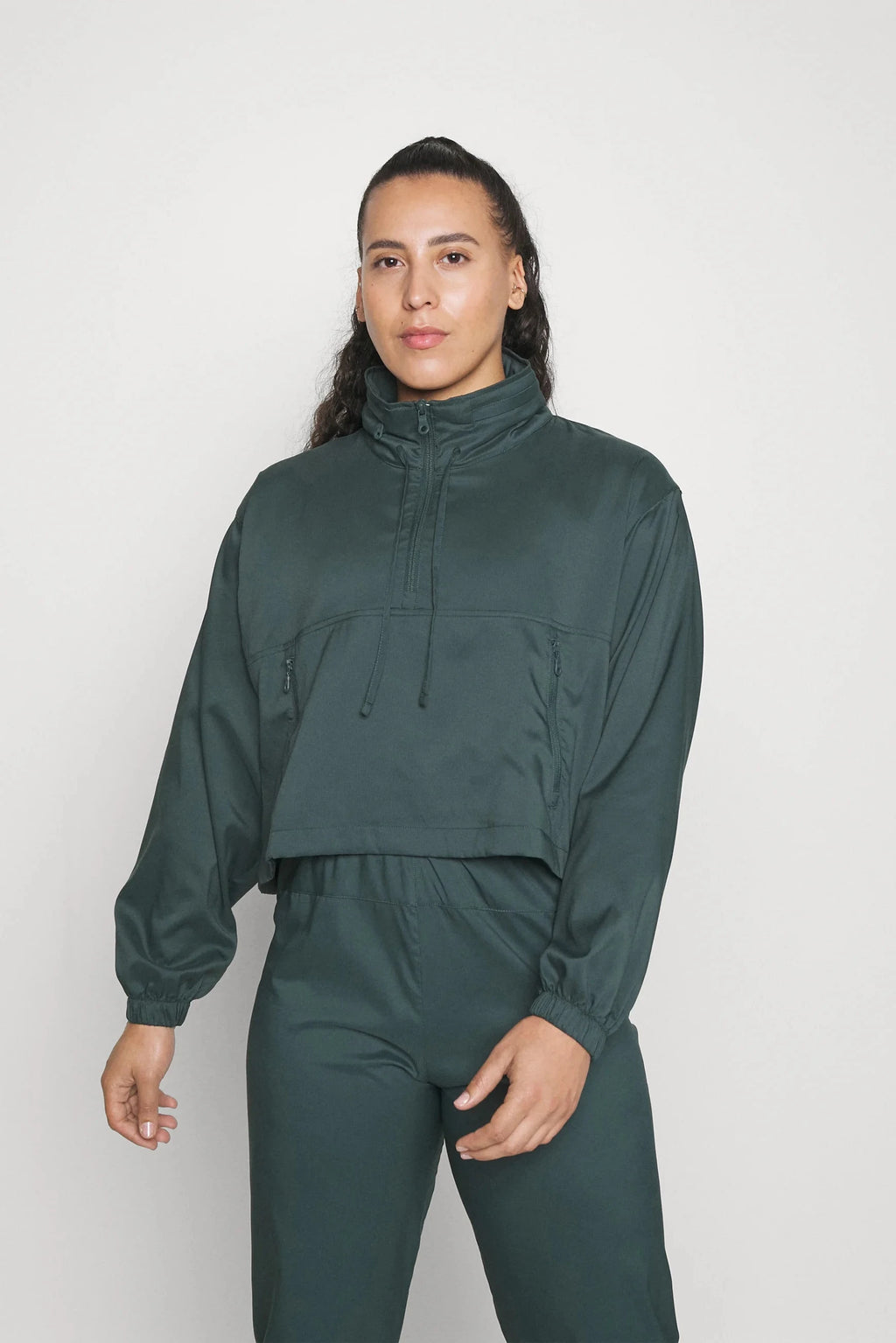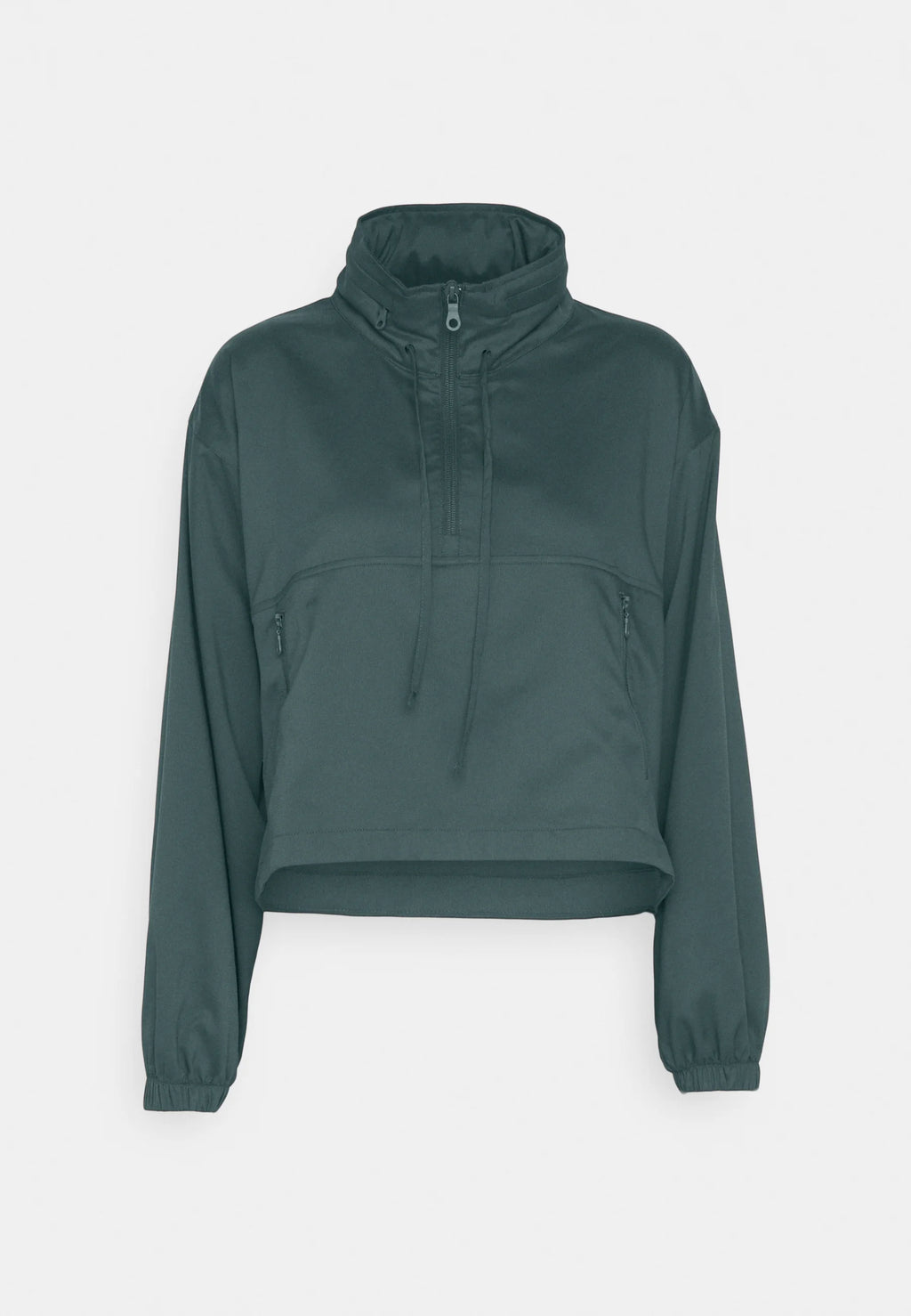 A water-resistant windbreaker pullover designed with a modern, cropped silhouette and functional versatility. Featuring a hideaway hood, adjustable cinched waist, and a secure zippered kangaroo pocket, it blends effortless style with everyday practicality.