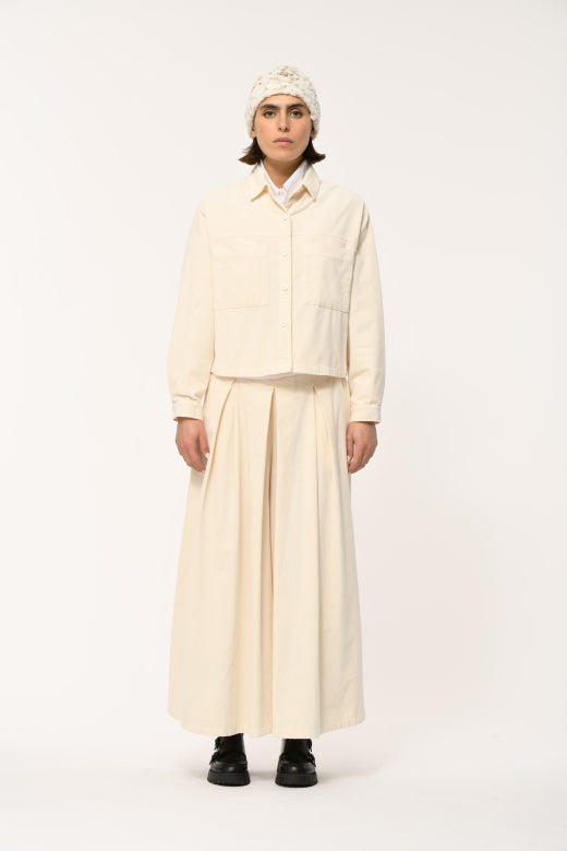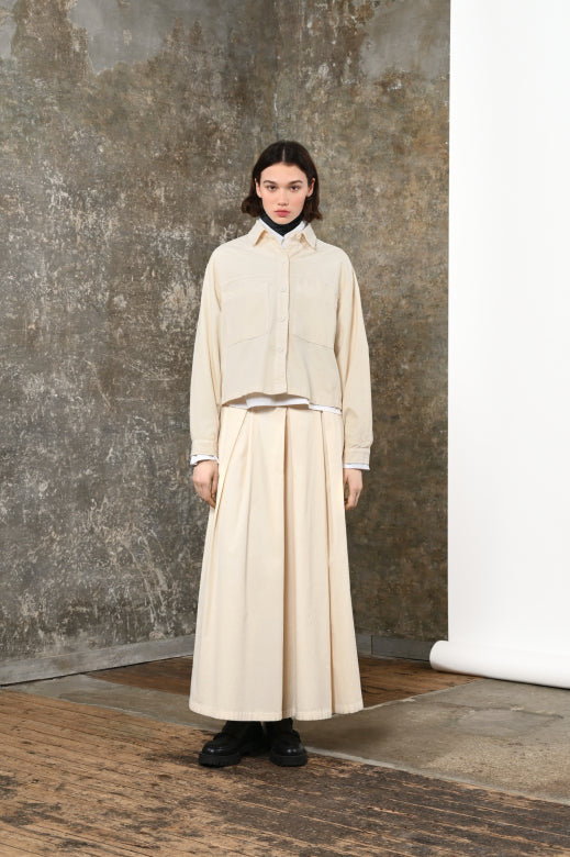 Designed with a classic shirt collar and tailored front and back seams, it features oversized chest pockets for a subtle utilitarian touch.