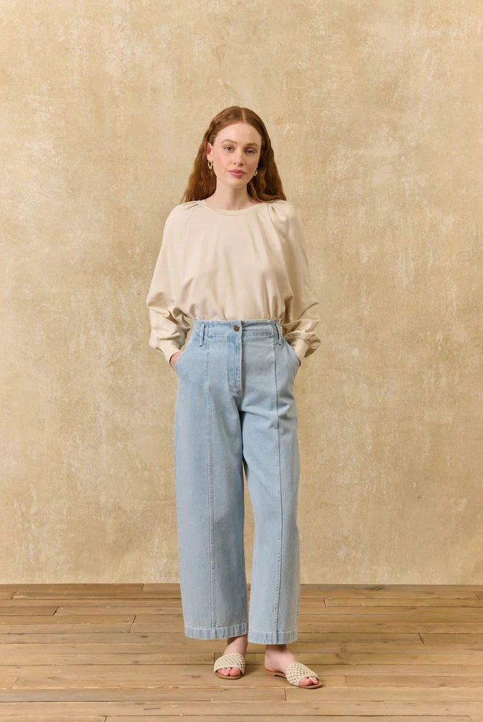 Almosi Light wash denim jeans are designed with a high waist and barrel shaped silhouette for a relaxed yet structured fit. Slanted side pockets add a subtle detail, making these jeans a versatile everyday staple with a contemporary edge.