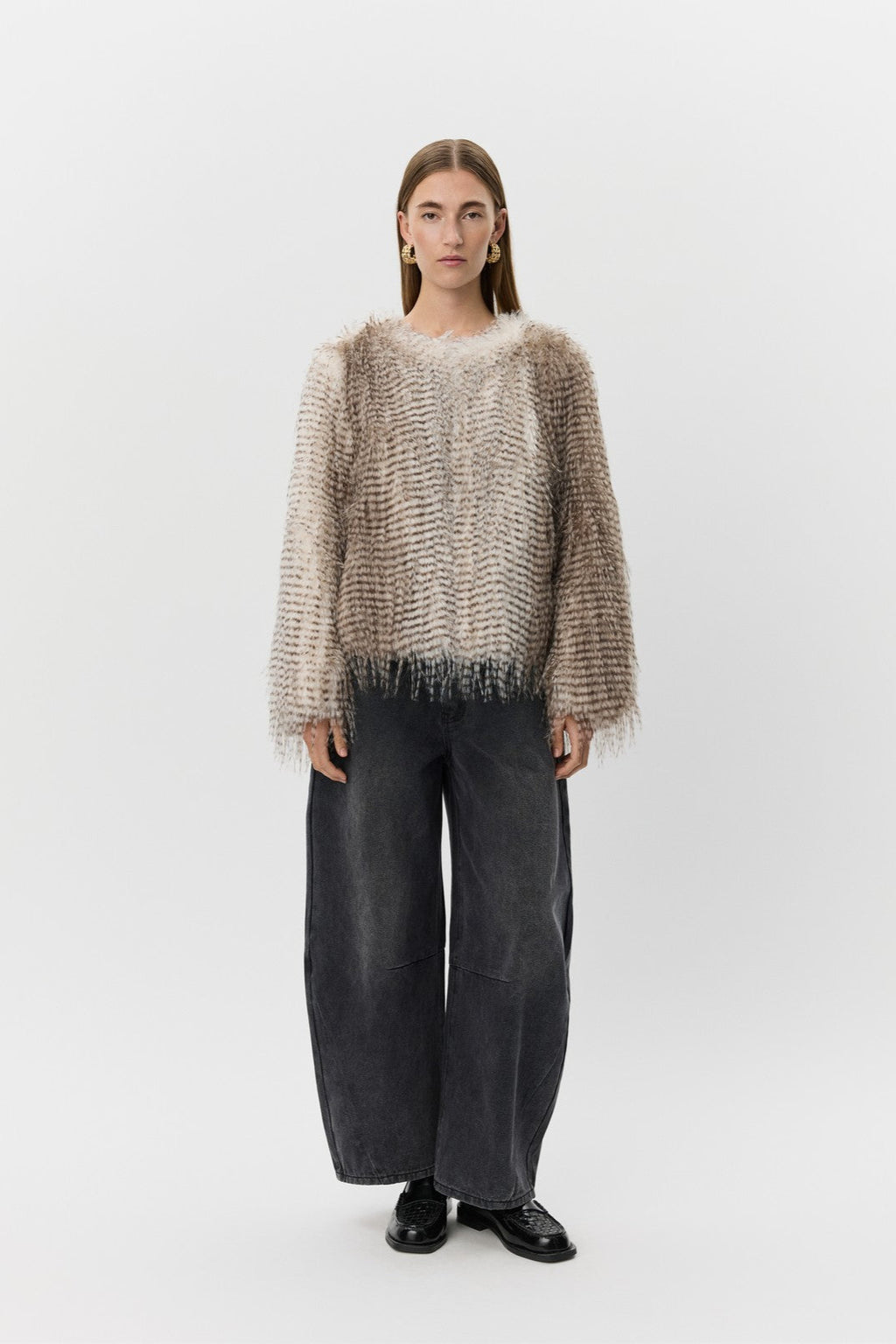 Wrap yourself in soft luxury with this statement jacket crafted from 100% polyester faux fur featuring rich brown stripes. Designed in a regular fit with a sleek round neckline and no collar, it exudes effortless sophistication. The fully lined interior ensures comfort, while discreet side pockets and hidden hook closures create a clean, refined finish. A modern essential that brings texture, warmth, and timeless style to any winter look.