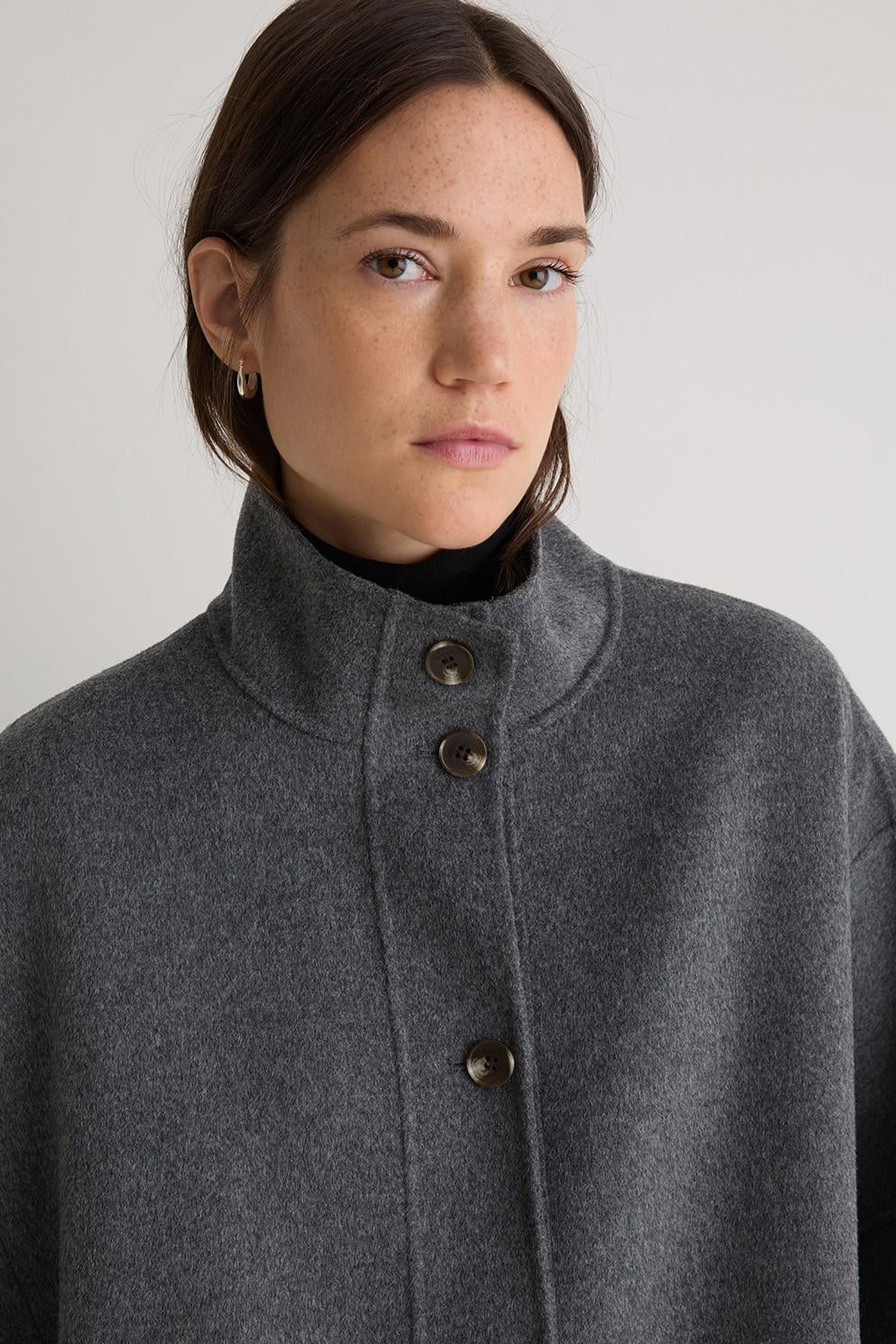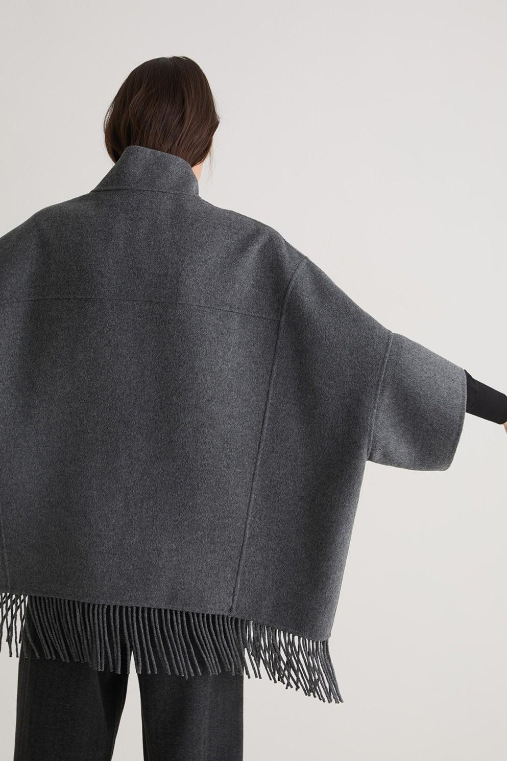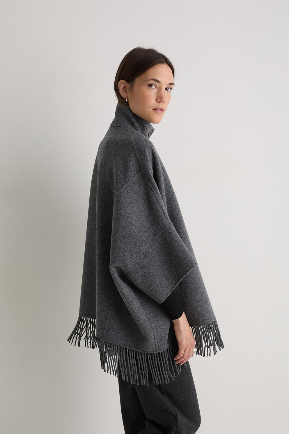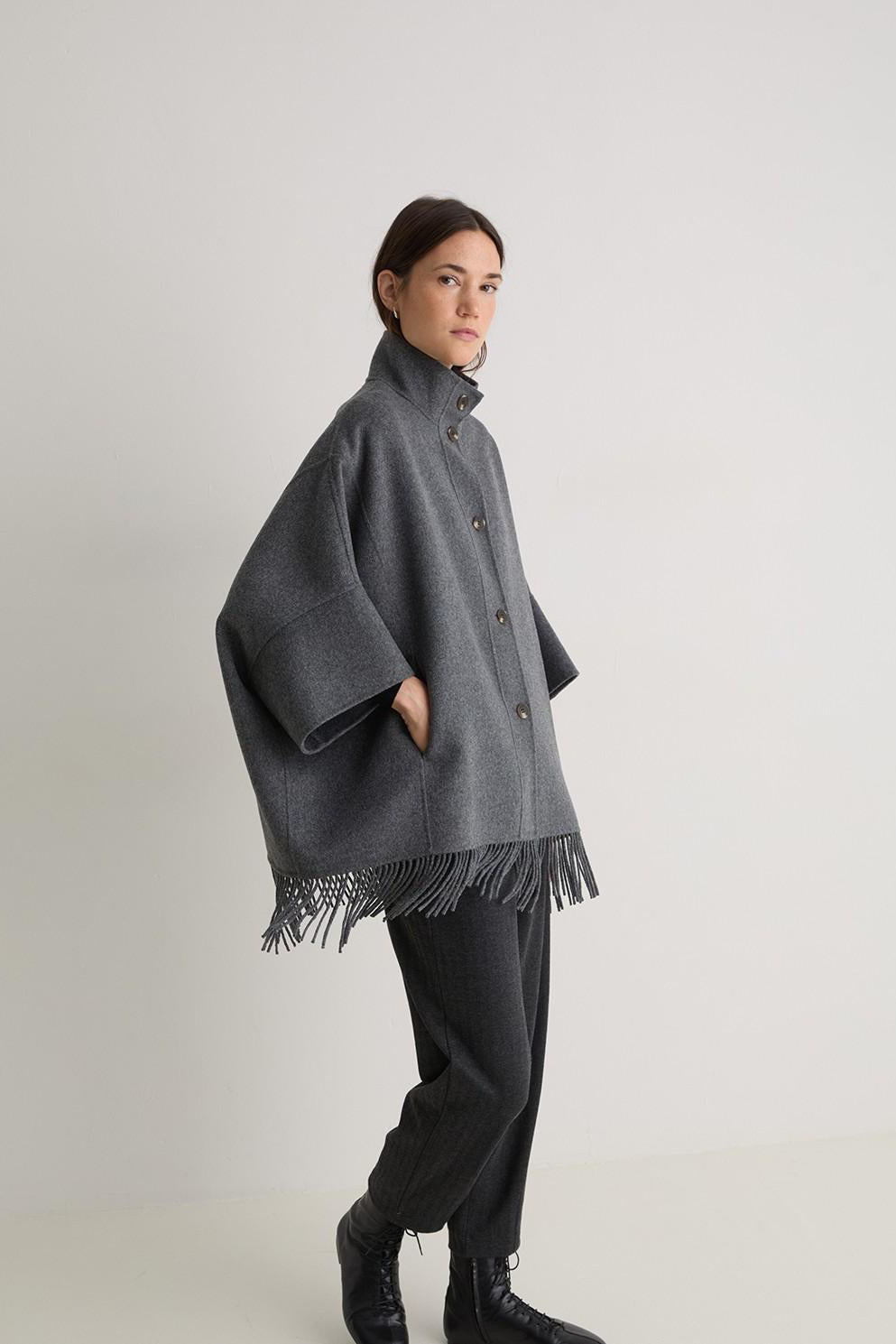 Drape yourself in effortless elegance with this grey wool cape-style coat, a statement layer designed for the cooler months. Crafted from a warm, soft wool blend, it features a flowing silhouette that moves beautifully with you. The fringe hem adds a touch of texture and bohemian charm, while the open-front cape design makes it perfect for layering over chunky knits or sleek eveningwear. Equal parts cozy and chic, it’s the perfect finishing touch for your autumn–winter wardrobe.