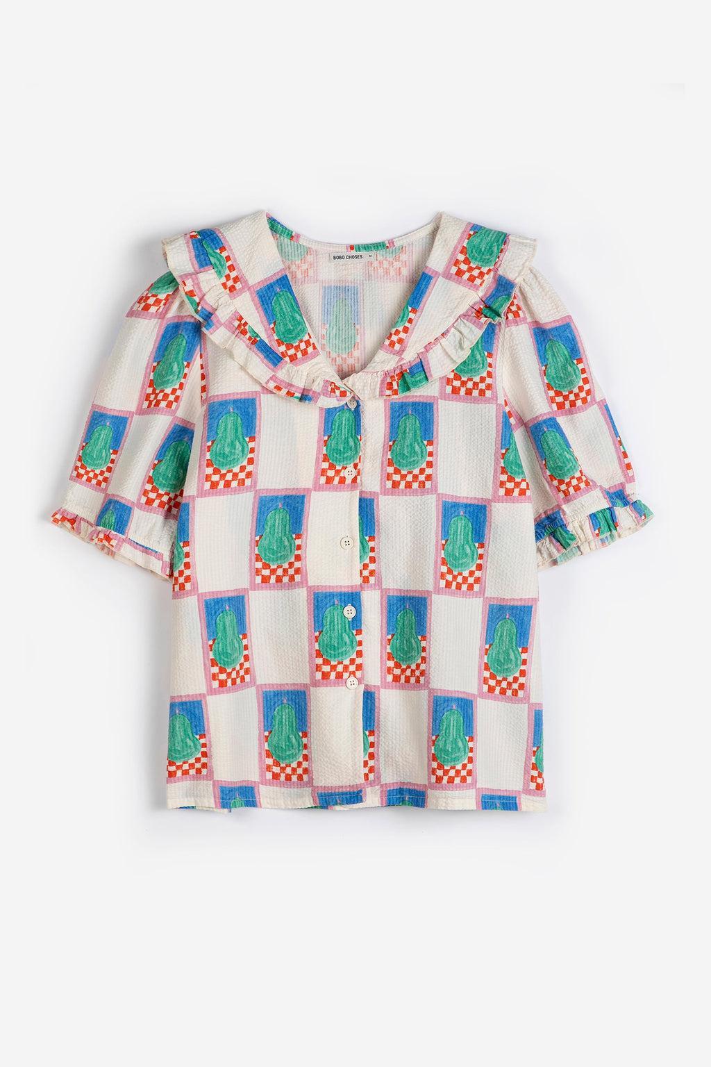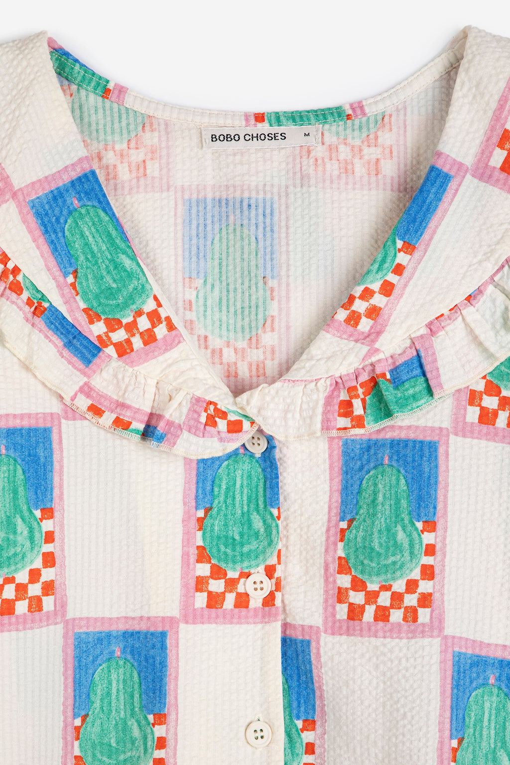 Fresh, playful, and full of personality, this short sleeve shirt is designed to stand out. Featuring a classic checker print as the base, it’s brought to life with pear motifs that look hand-painted for an artistic, one-of-a-kind feel. The relaxed short-sleeve silhouette keeps it easy and wearable, while the bold print mix delivers effortless, fashion-forward style. Pair it with denim, tailored trousers, or shorts for a look that feels creative, cool, and perfectly suited for warm days.