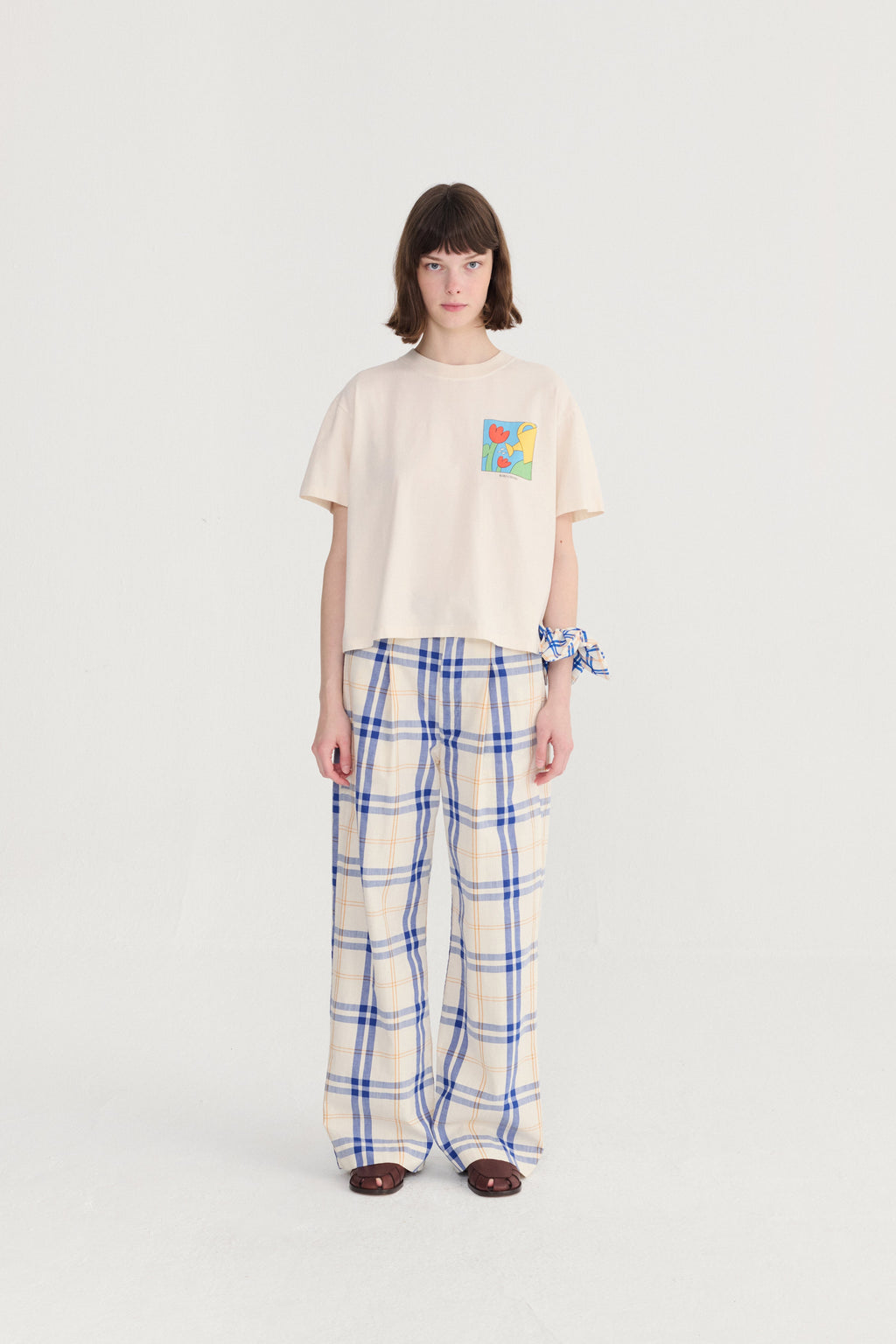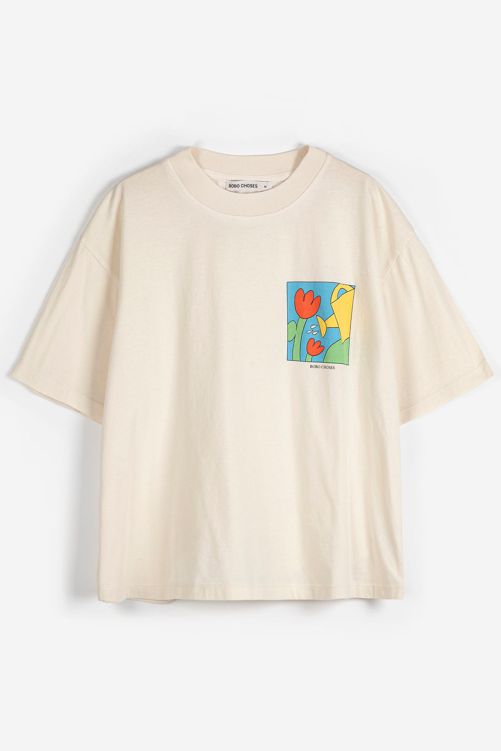 A refined essential with a subtle statement. This white T-shirt features a slightly loose silhouette designed for effortless wear. A delicate floral gardening motif, framed within a clean box, is placed at the chest corner for a quiet yet distinctive detail. Minimal and intentional, it balances softness with structure, making it a versatile piece for elevated everyday styling.