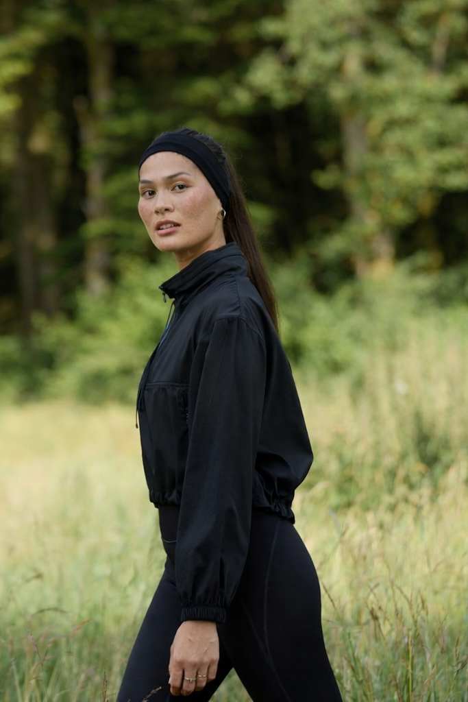Perfect for training and fitness, this piece features a sleek standing collar with a high-fastening chin guard, a smooth continuous front zip with lining, and elasticated cuffs and waist for a flattering, comfortable fit. Designed with practical inseam pockets and a clean, minimalist silhouette, it combines functionality with effortless style.