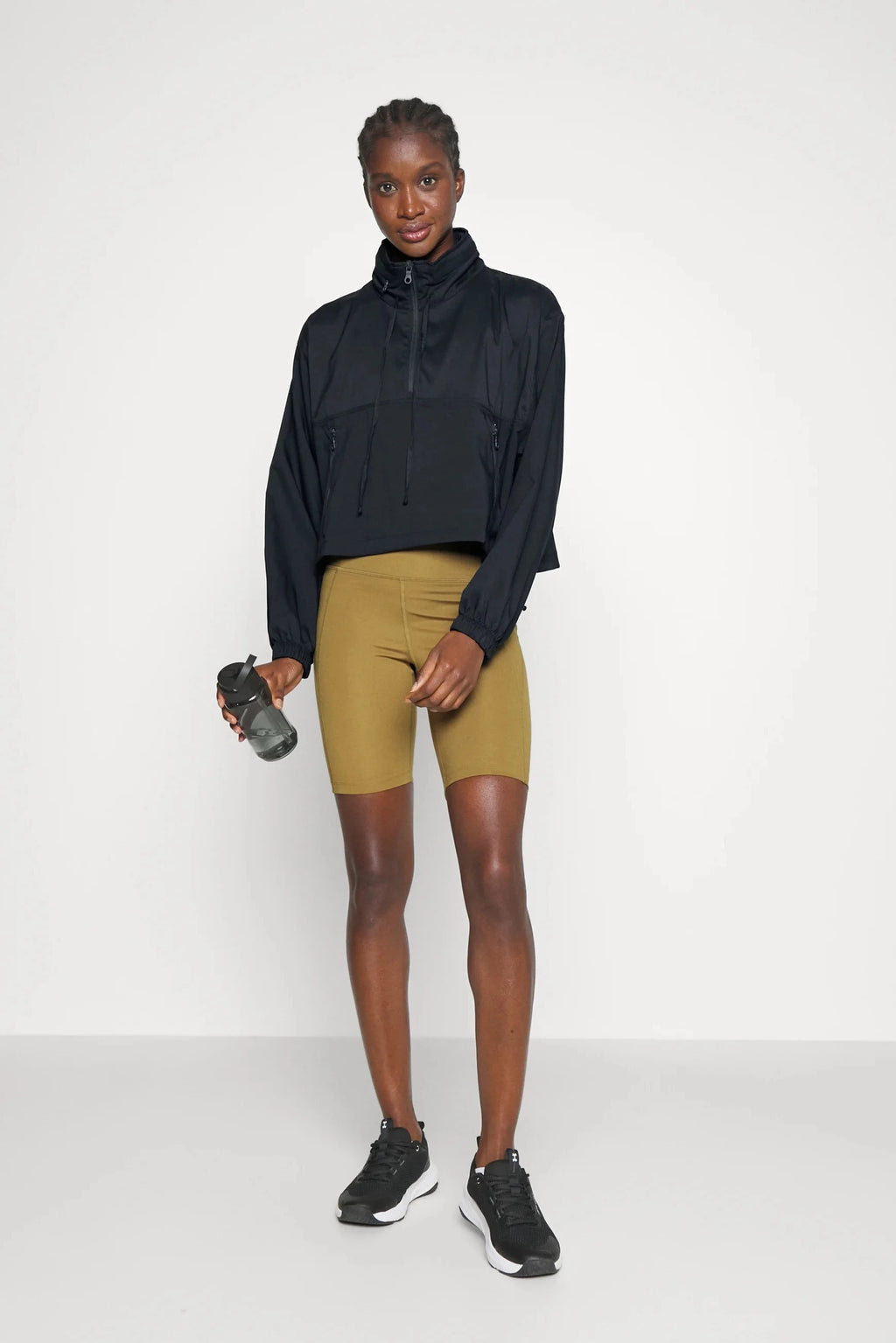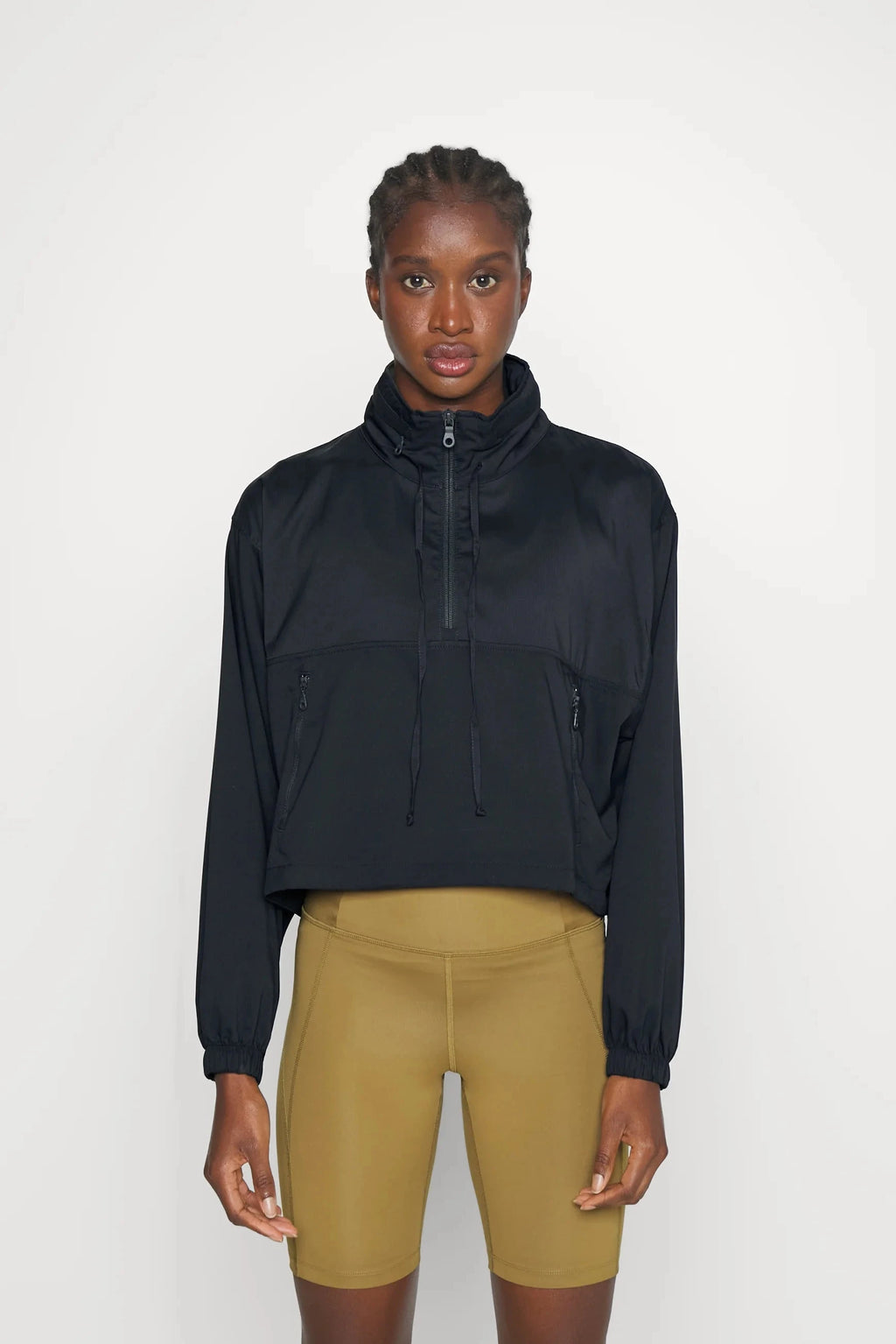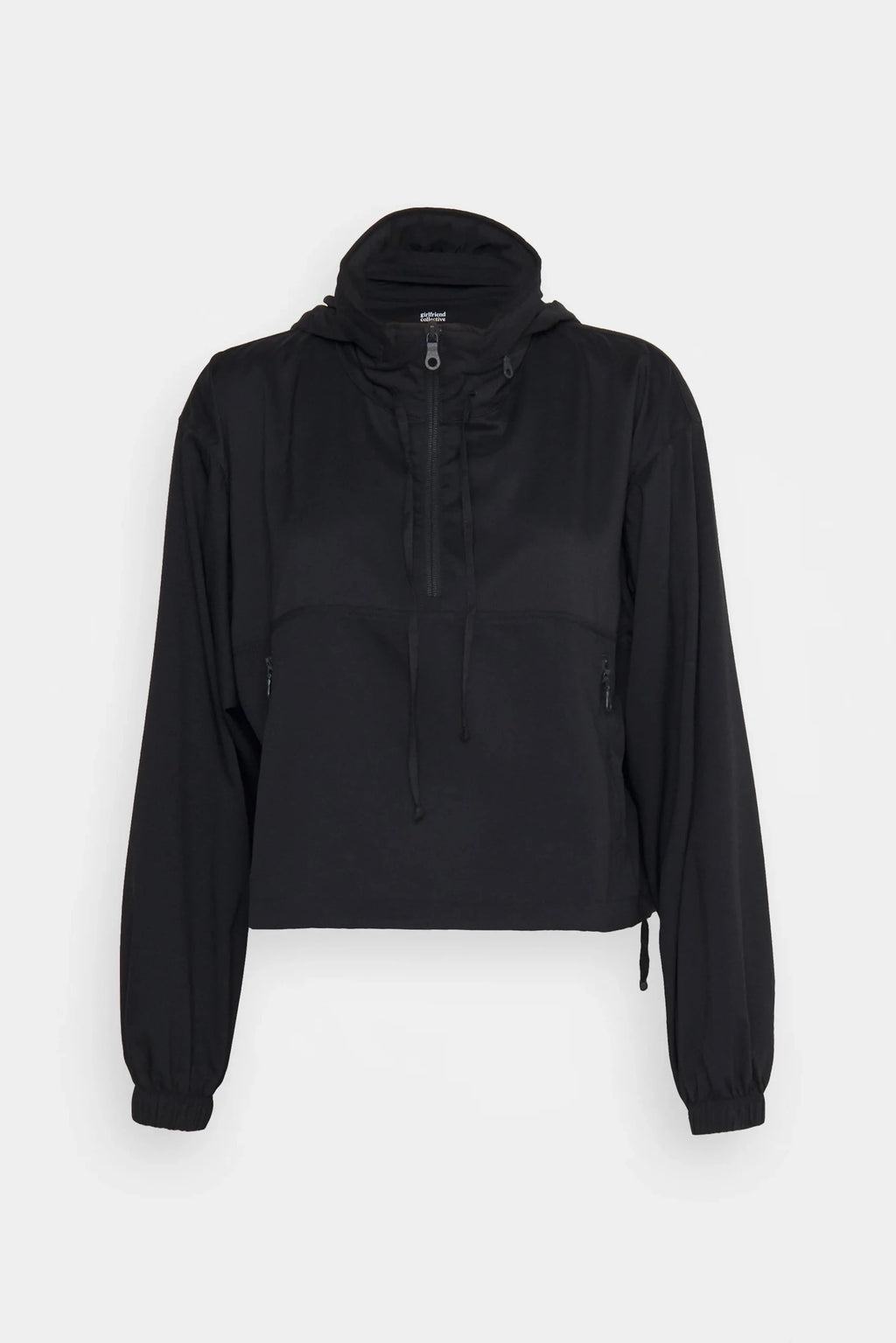 A water-resistant windbreaker pullover designed with a modern, cropped silhouette and functional versatility. Featuring a hideaway hood, adjustable cinched waist, and a secure zippered kangaroo pocket, it blends effortless style with everyday practicality.