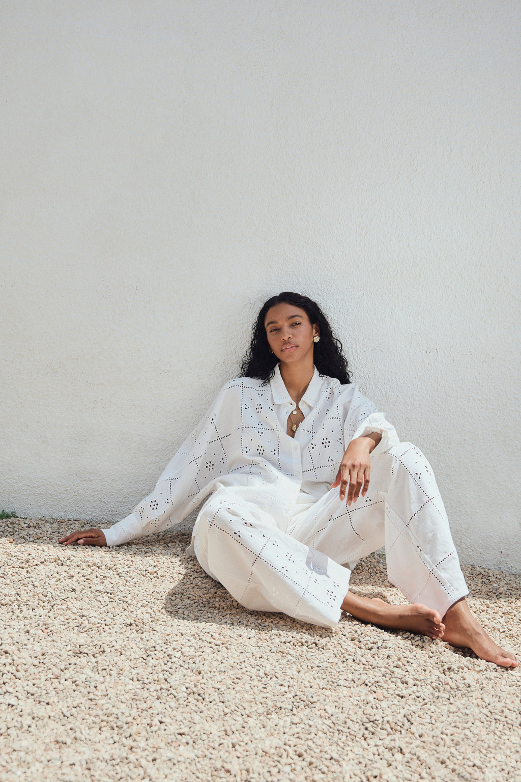 Relaxed wide-leg trousers in lightweight white cotton, finished with delicate all-over broderie eyelet in a subtle grid with floral cutwork. Designed with a comfortable elasticated waistband, they fall loosely through the leg for an easy, flattering silhouette.