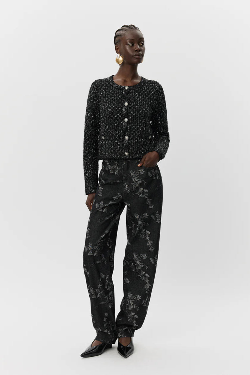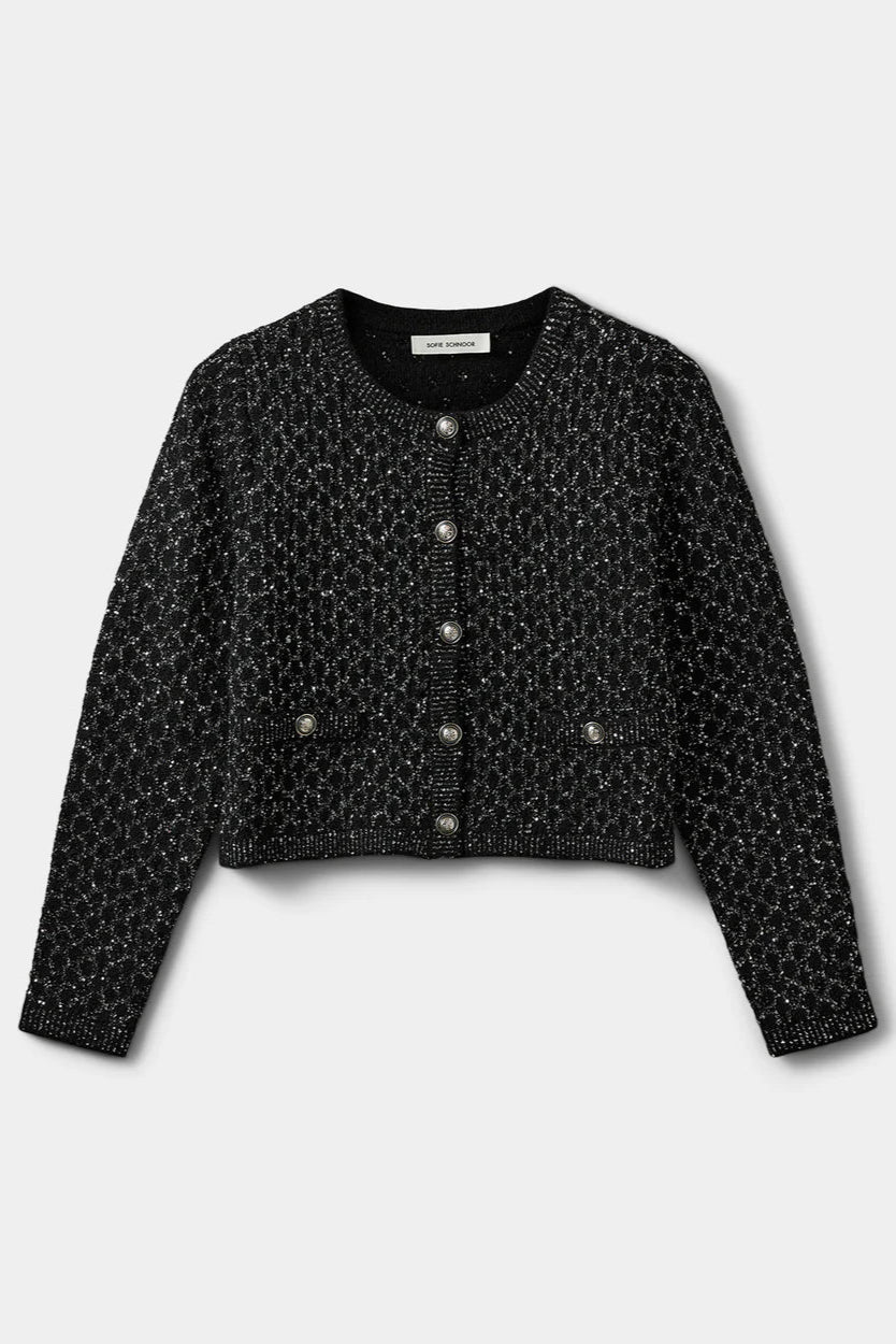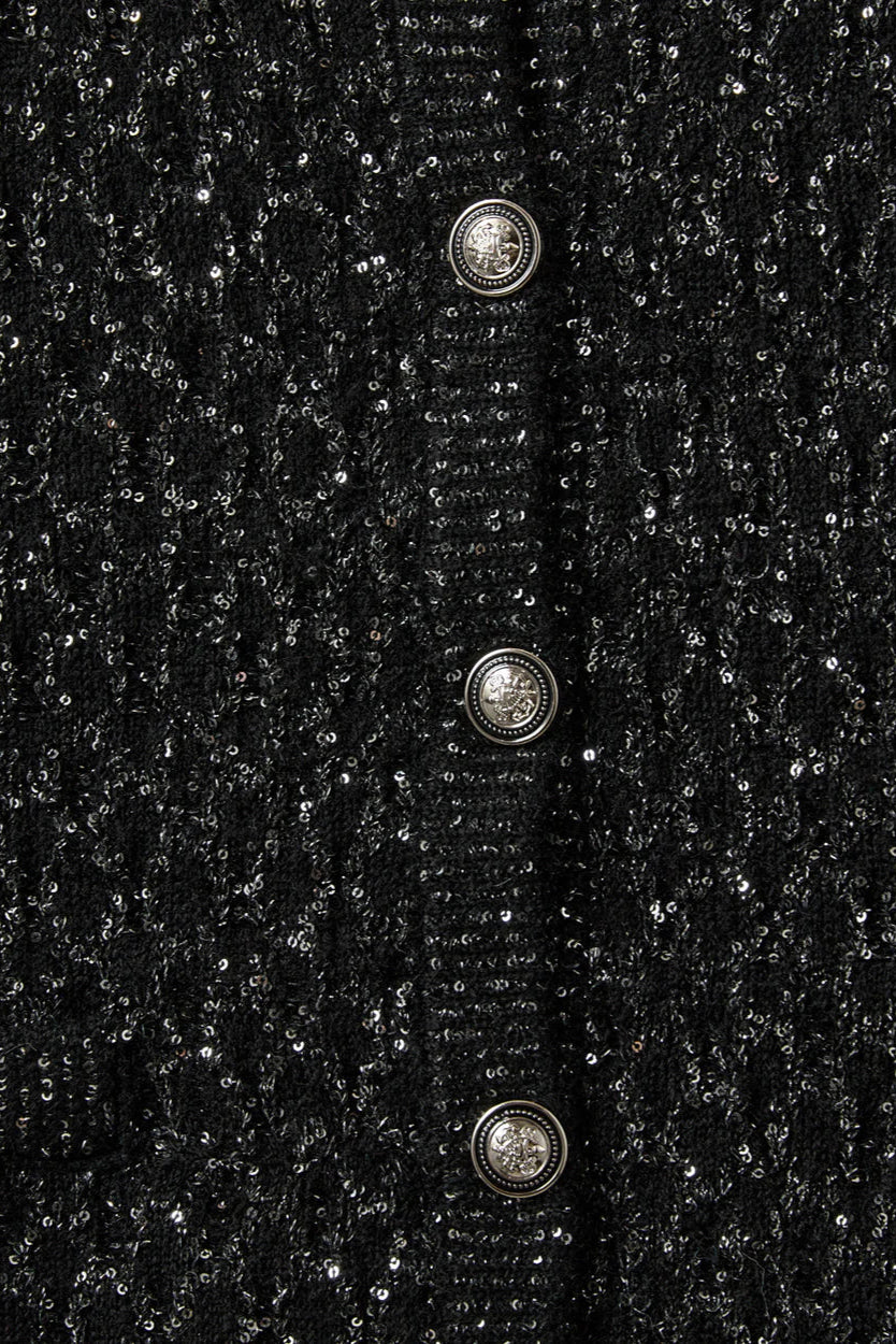 Add a touch of understated glamour to your everyday style with this black sparkle knit cardigan. Designed with a hint of shimmer, it fastens with elegant silver buttons down the front for a refined finish. The design features two decorative front pockets with button closure, adding both charm and detail. Ribbed edges and pocket trims bring structure and sophistication, making this cardigan a versatile piece to layer over dresses, blouses, or casual tops. Perfect for taking you seamlessly from day to evening.