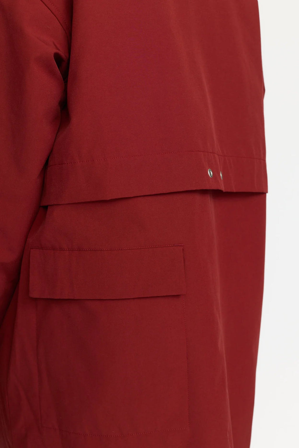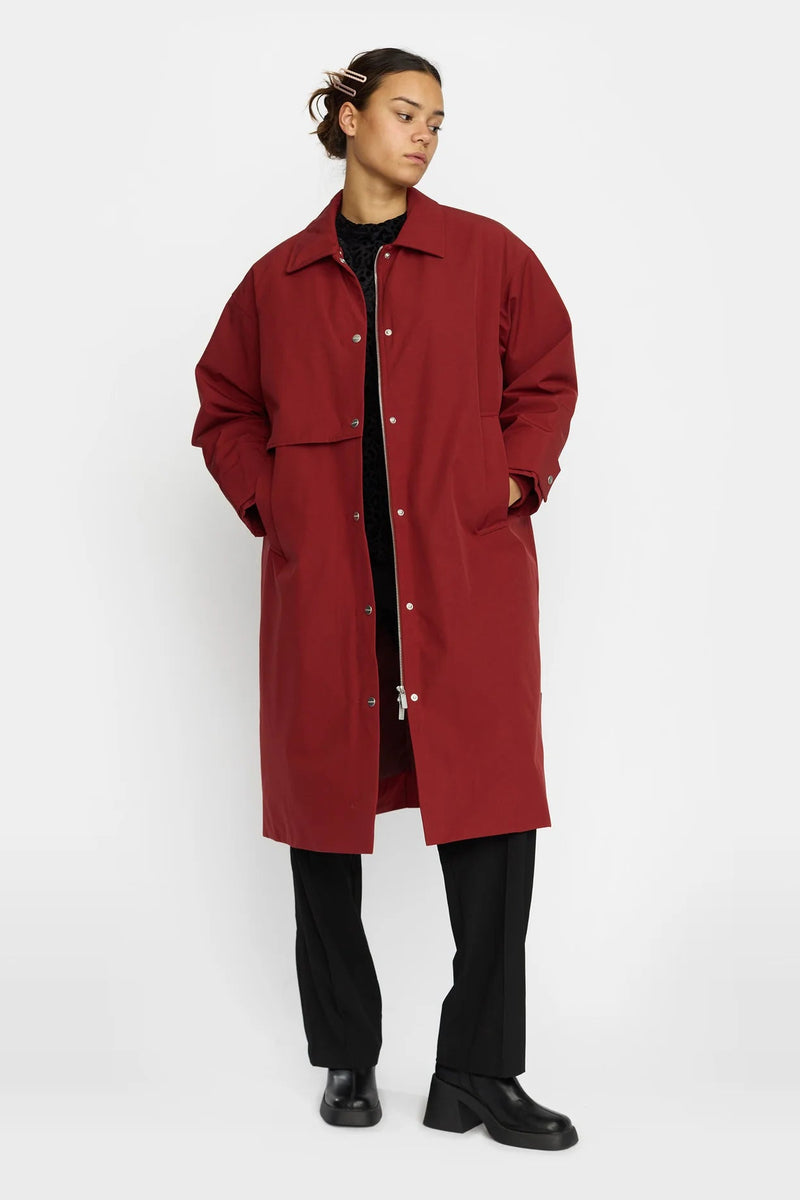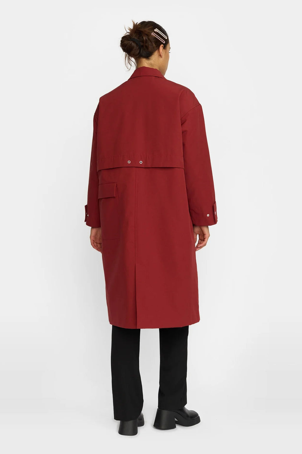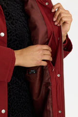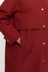This long winter trench coat combines timeless design with modern functionality. Crafted from a durable nylon–cotton blend, it features a slightly oversized silhouette with drop shoulders for a contemporary, relaxed fit. The front placket closes with a hidden zipper and signature silver snap buttons, while metal eyelets at the back add a technical edge. A unique back pocket at the hip gives the piece a playful twist.