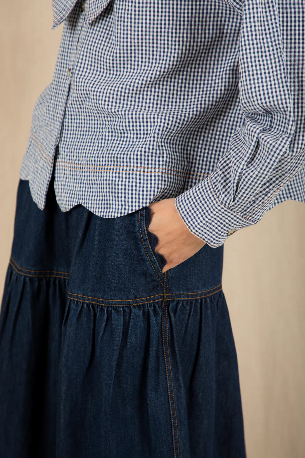 Timeless with a contemporary edge, this long denim skirt is crafted in a rich dark-wash denim for a look that feels both polished and versatile. The deep indigo tone adds a refined finish, making it easy to dress up or down throughout the seasons.