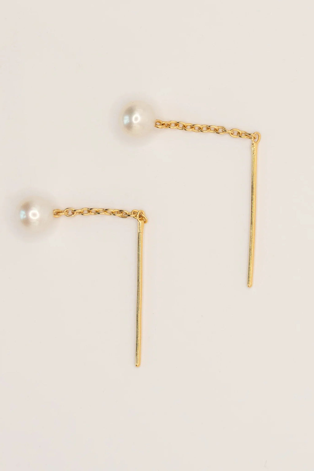 Freshwater pearls sit into the ear with a classic fine chain drop at the back. These refined earrings deliver subtle sophistication. A timeless accessory that transcends fleeting trends with its ensures grace