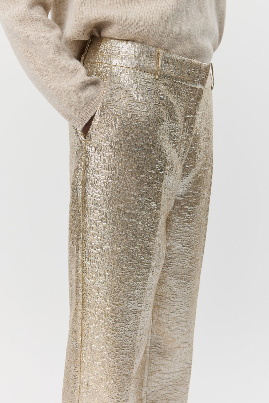 Make a statement with these eye-catching crushed gold trousers, designed with a contemporary slim-leg silhouette for a flattering, tailored fit. The textured metallic finish catches the light beautifully, adding instant glamour to any outfit. Perfect for parties, evening events, or elevating your everyday wardrobe, these trousers pair effortlessly with a sleek blouse or a fitted top for a chic, modern look.