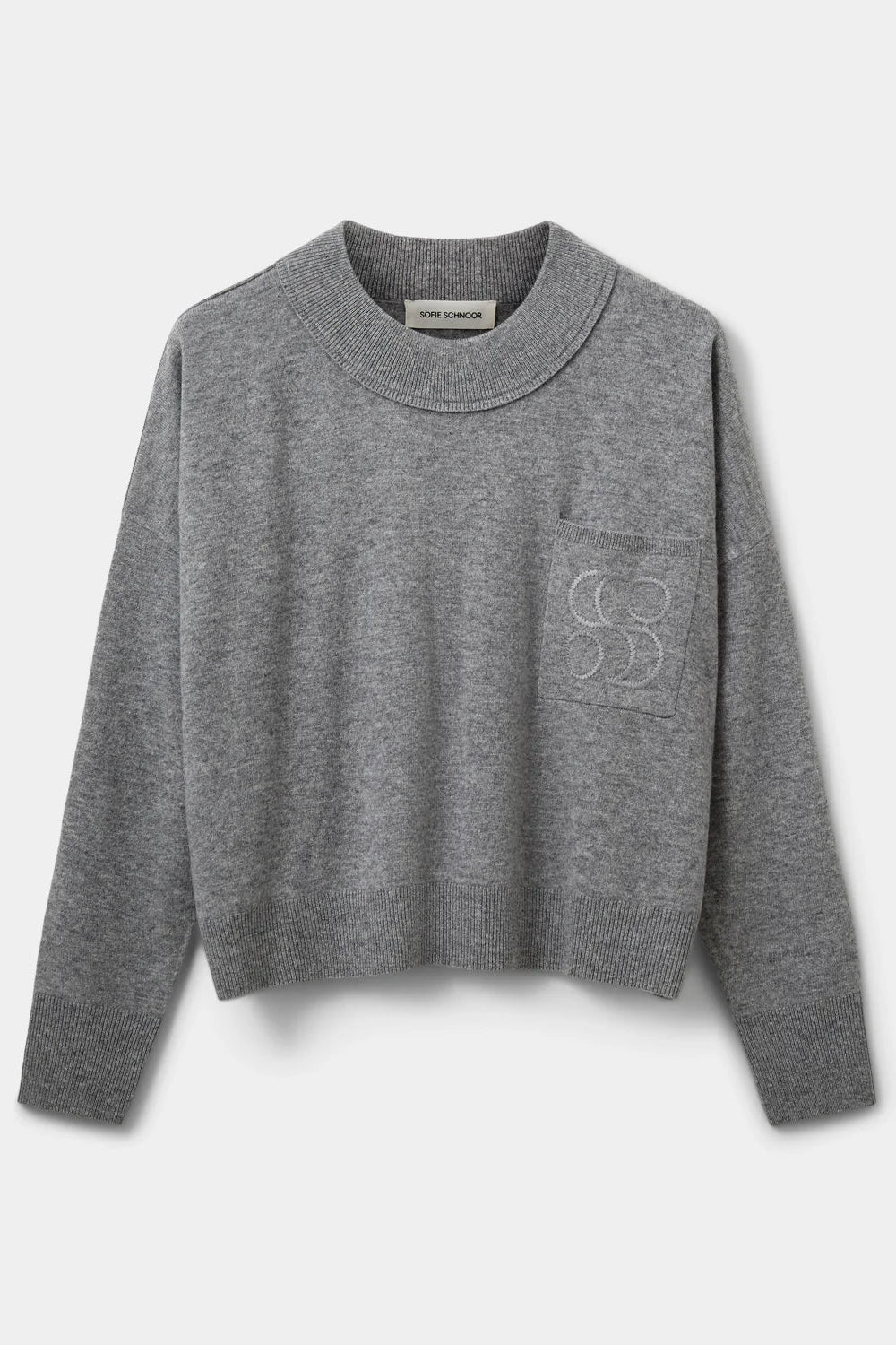 Timeless comfort, elevated with subtle detail. This regular-fit grey knit sweater is crafted for effortless everyday wear, featuring wide ribbed edges at the neckline, hem, and sleeves for structured softness. A sewn-on pocket with discreet tone-on-tone embroidery adds a refined, understated touch, making this sweater a versatile wardrobe essential with thoughtful design.