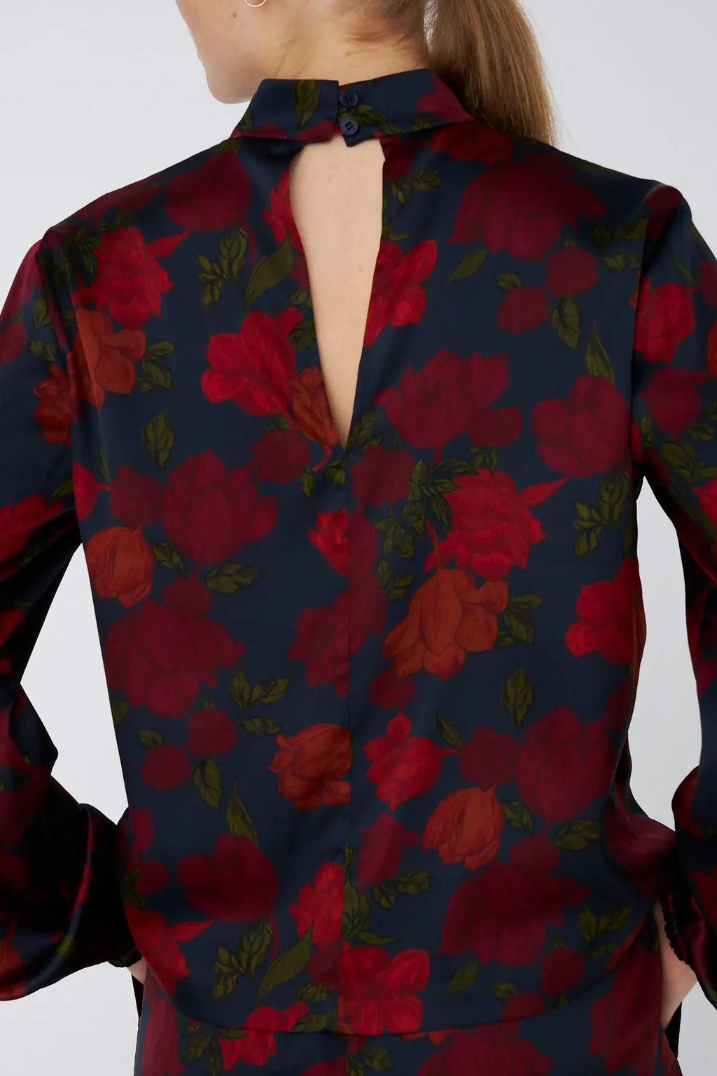 Romantic and refined, this long-sleeved silk blouse is adorned with an elegant floral print that brings timeless femininity to any wardrobe. The high neckline contrasts beautifully with a V-shaped back opening, secured by a delicate button closure at the neck.