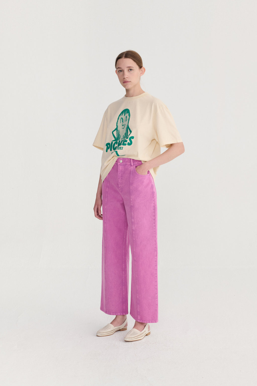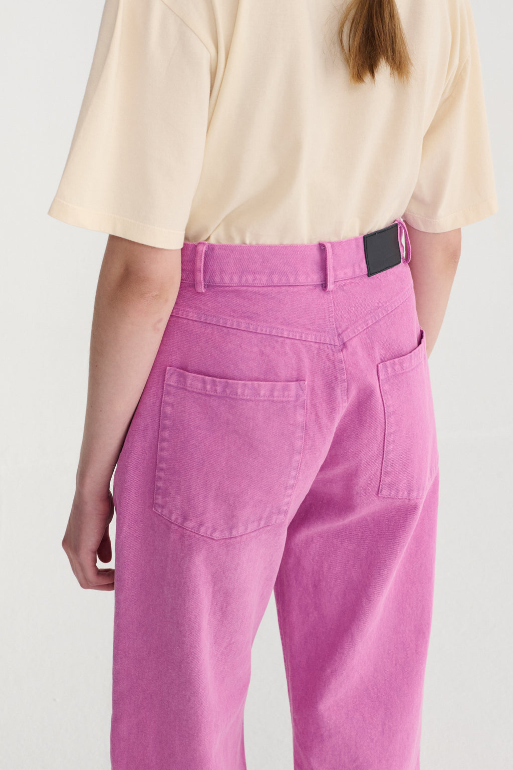 Designed for effortless wear, these purple pants feature a relaxed silhouette with a mid-rise waist and a straight-leg cut. The cropped length adds a contemporary edge, making them easy to style from day to night. Crafted from 100% organic cotton, they offer breathable comfort while maintaining a structured, polished look.