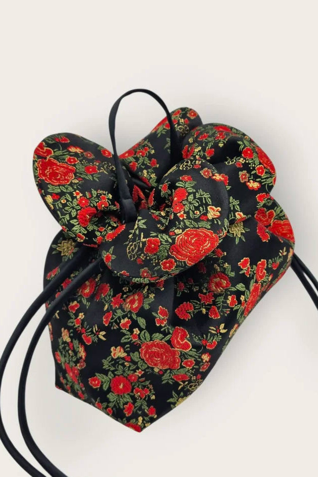 A softly structured drawstring bag inspired by the silhouette of a flower box in bloom. Satin-covered drawstrings with a signature knot detail cinch the bag closed, secured with a polished metal cord lock and hidden magnetic fastening. Inside, a spacious compartment with a zipped pocket keeps essentials close. Designed for versatility — carry it by the detachable top handle for a neat tote, or style it with the removable strap for an effortless shoulder or crossbody look.