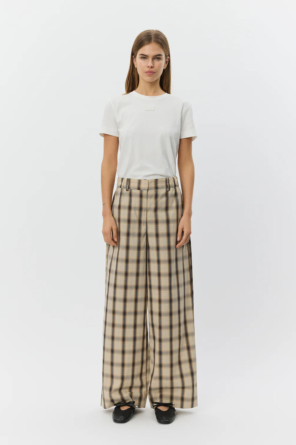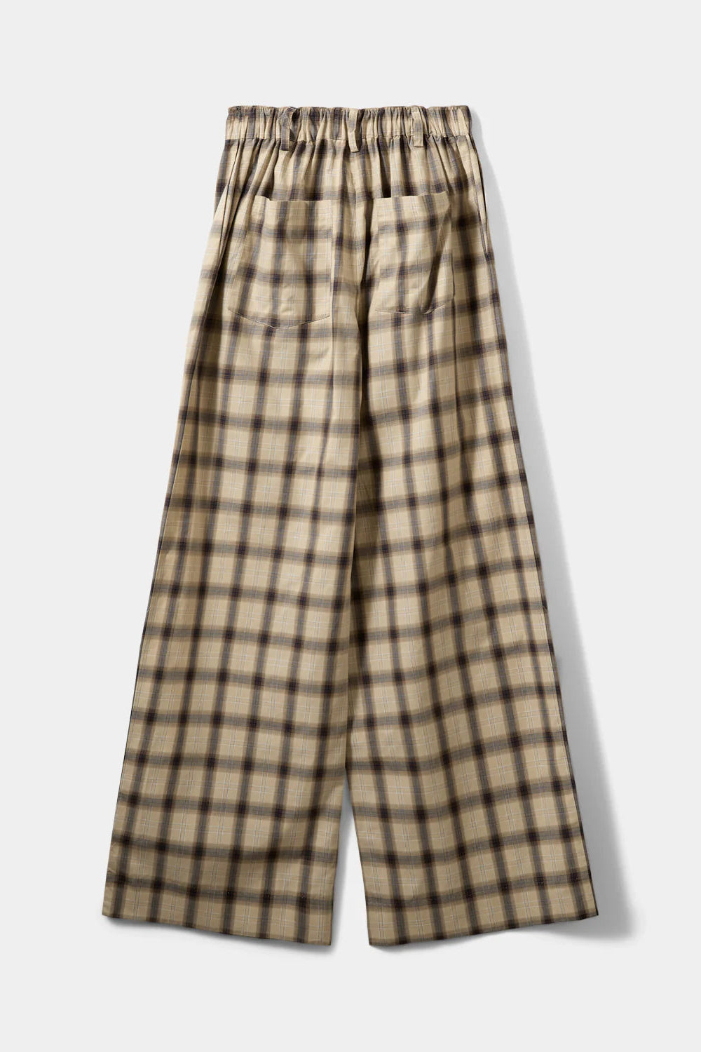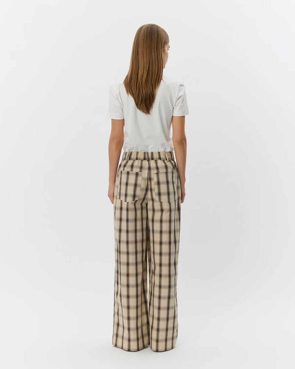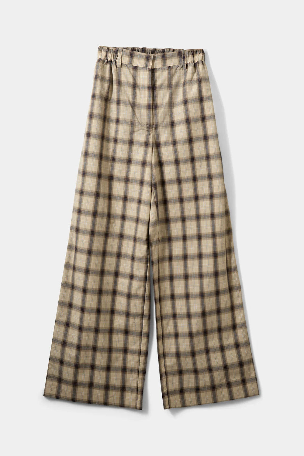 Effortlessly combining comfort and modern sophistication, these wide-leg high-waist trousers are designed to elevate your everyday wardrobe. Featuring a timeless check pattern, they offer a polished look while maintaining a relaxed, easy-to-wear feel. The high-rise silhouette flatters the waist and elongates the legs, while the elastic waistband ensures all-day comfort and a flexible fit.