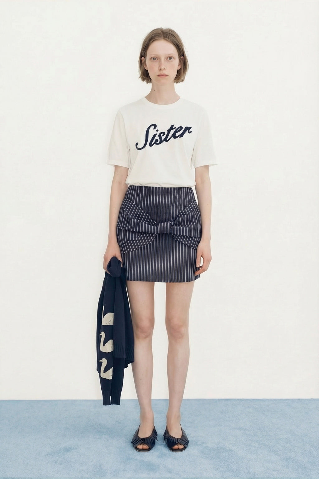 Cut from lightweight cotton with a dry, crisp hand, this mini skirt features a soft Navy base woven with subtle yarn-dyed stripes. The silhouette is elevated by an exaggerated bow at the front and a discreet back zip for a sleek finish.