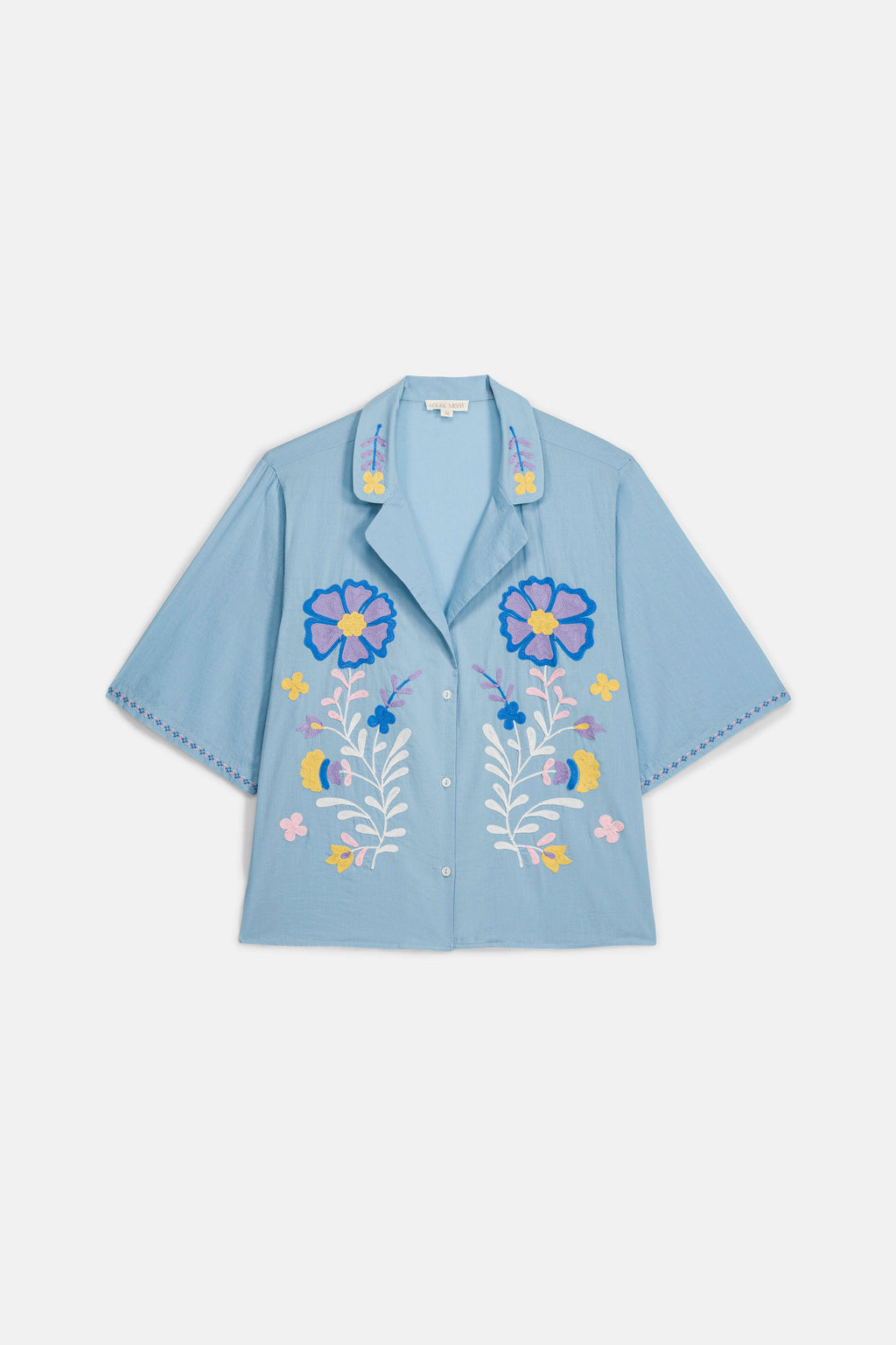 Emilius is cut in a hue of blue , short-sleeved and accented with delicate embroidery that adds a gentle, handcrafted touch. Light, breathable, and easy to wear, it’s perfect for warm days and effortless styling.