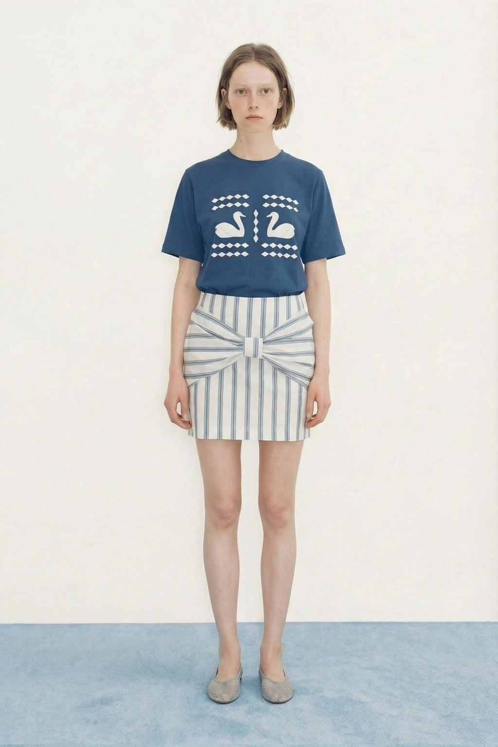 This navy tee brings subtle charm to your wardrobe with a graceful swan print. Made from soft cotton for all-day comfort, it’s an easy-to-style piece that pairs beautifully with jeans and skirts