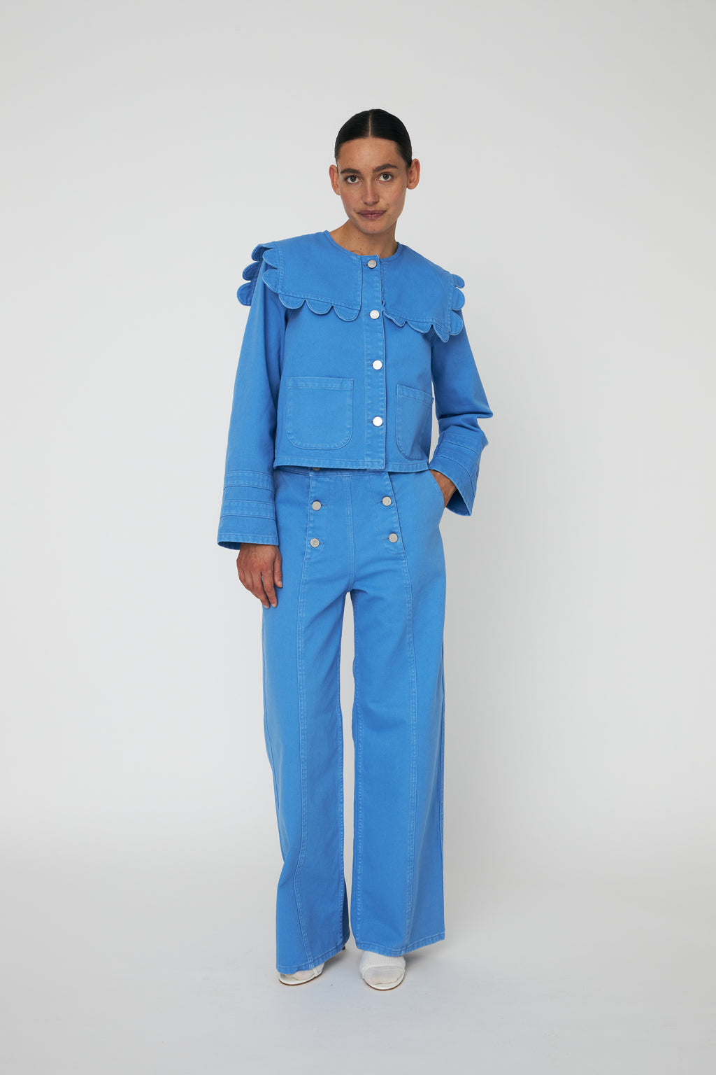 These mid-waist trousers feature a straight-leg silhouette and a signature sailor-style front for timeless appeal. Crafted in a vibrant blue coral hue, they’re finished with practical side pockets, offering a perfect balance of style and functionality. Ideal for elevating everyday outfits with a refined, contemporary touch.