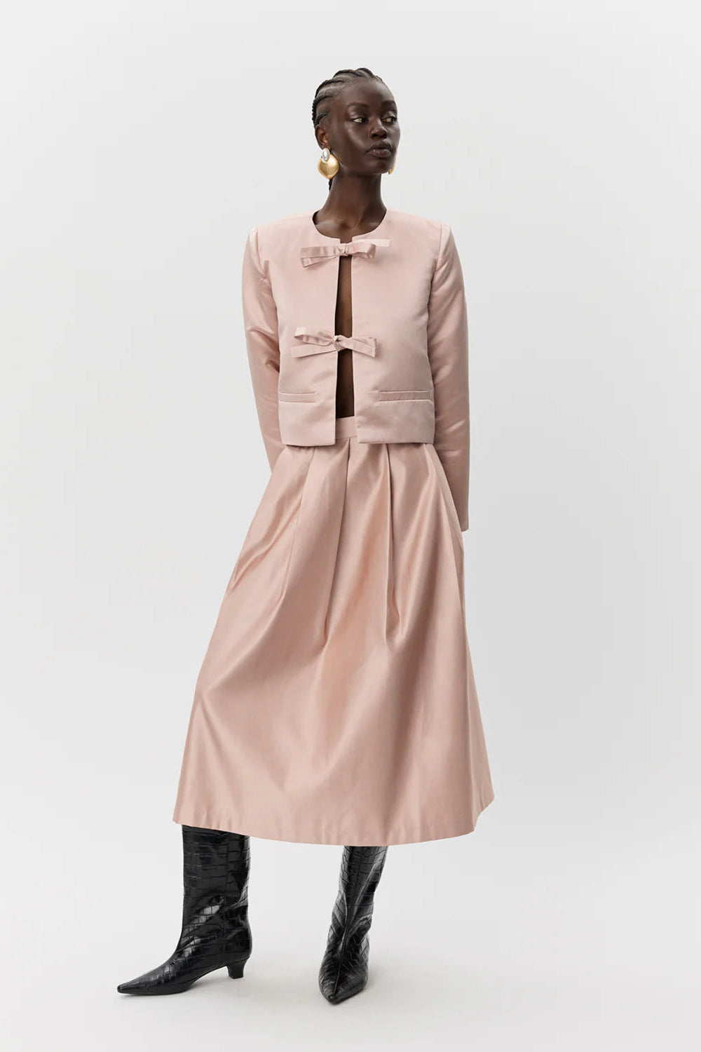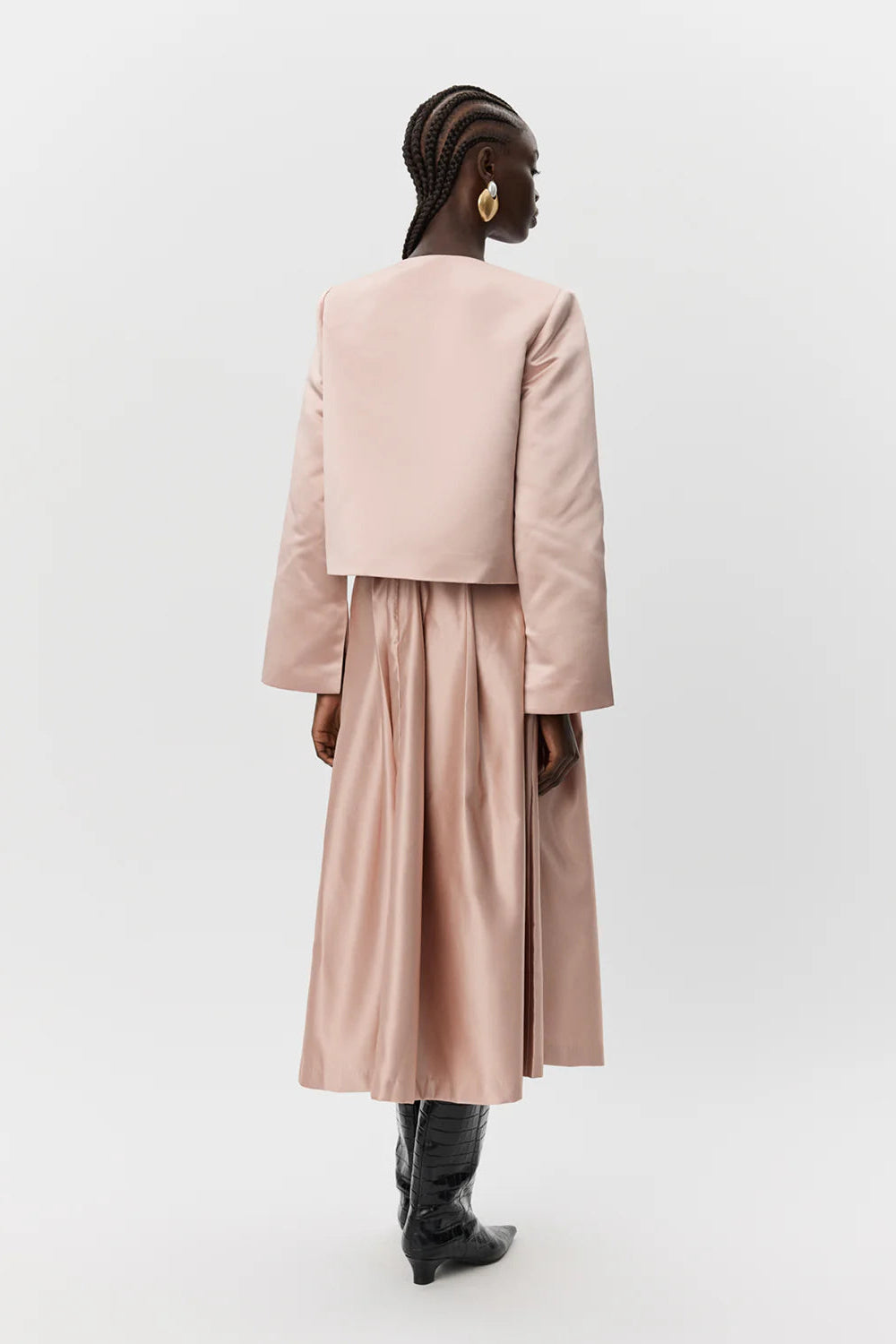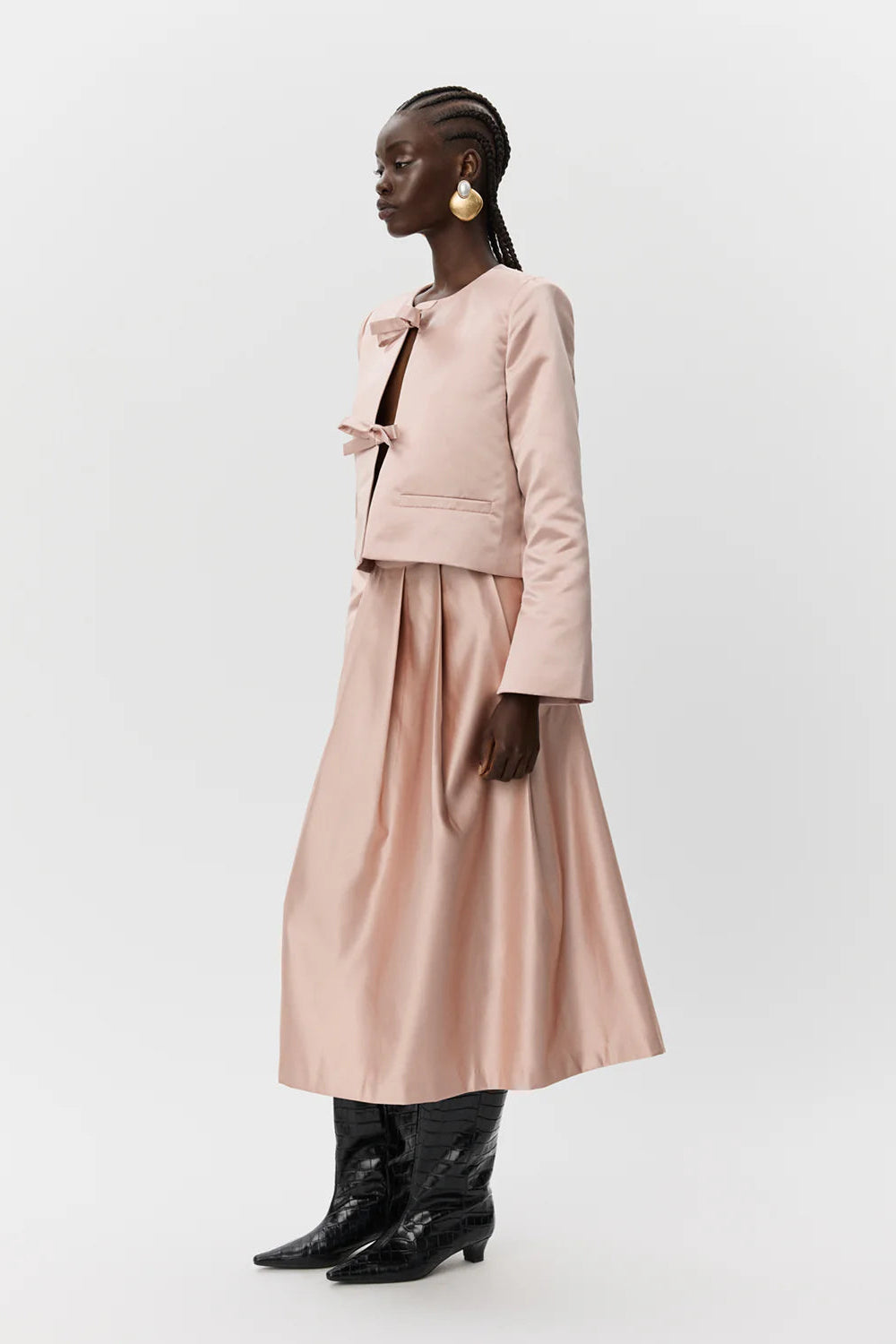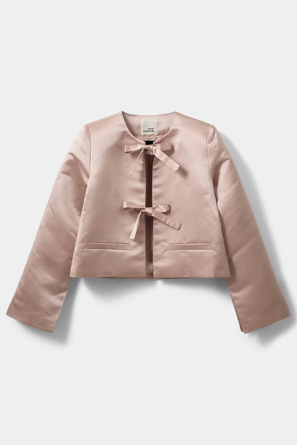 Elevate your look with this chic cropped jacket, designed for effortless sophistication. Crafted with a smooth, satin-like fabric that catches the light with a soft matte sheen, it brings understated luxury to any outfit. The open front closes gracefully with delicate strings that tie into a bow, allowing you to define your waist for a flattering silhouette. Featuring long sleeves with subtle slits and two decorative welt pockets, this collarless jacket blends minimal design with refined detailing—perfect for layering over dresses or high-waisted separates.