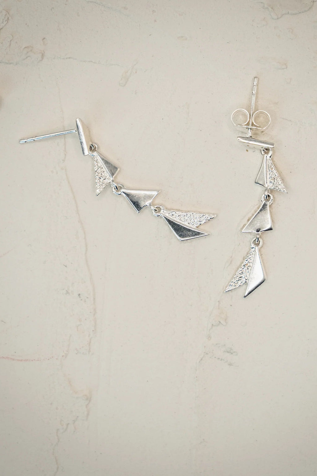 Elegant gold triangles with contrasting textured and polished surfaces. These shard drops move gracefully with you, balancing feminine sophistication with an edgy modern twist. Understated luxury for any earring lover.