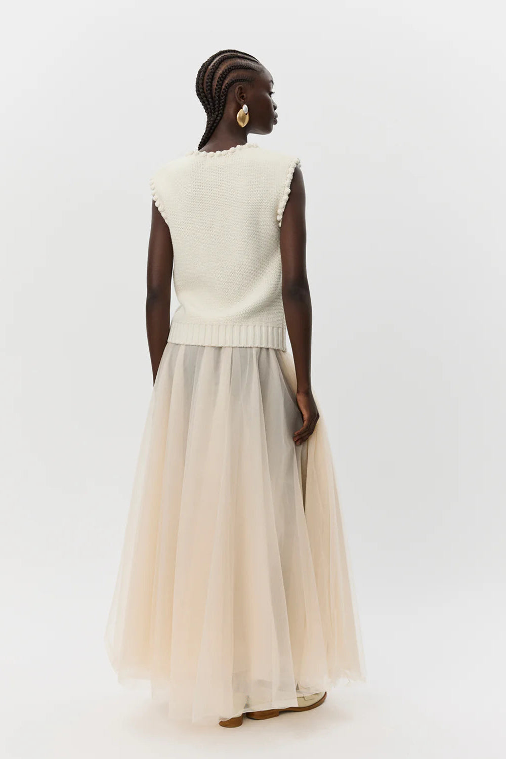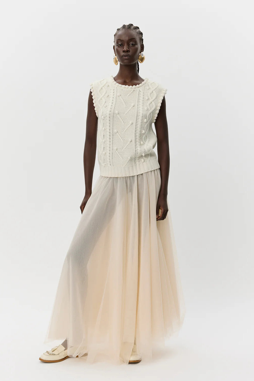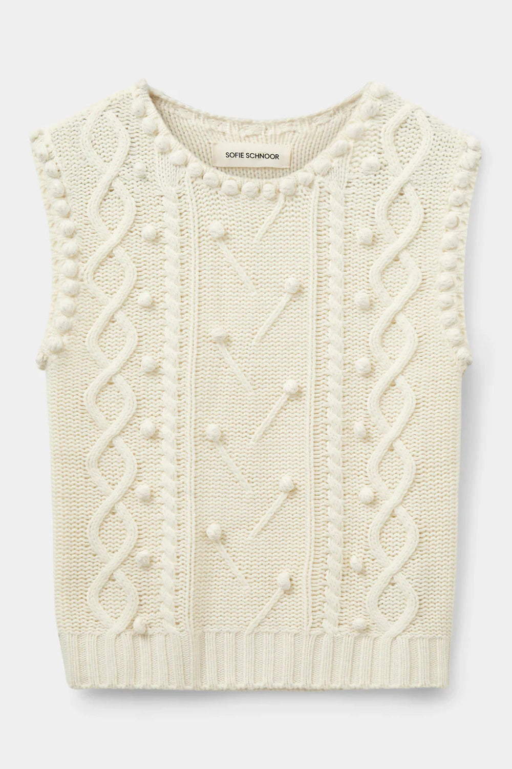 Chic, cozy, and endlessly versatile — this knitted vest is the perfect layering piece for the modern woman. Designed with a flattering regular fit and a classic round neckline, it features a beautifully textured pattern accented with delicate embellishments for a touch of elegance. Crafted from 100% superfine merino wool, it offers luxurious softness, natural breathability, and gentle temperature regulation to keep you comfortable in every season. Effortlessly stylish whether layered over a blouse or worn on its own, this vest adds timeless sophistication to any outfit.
