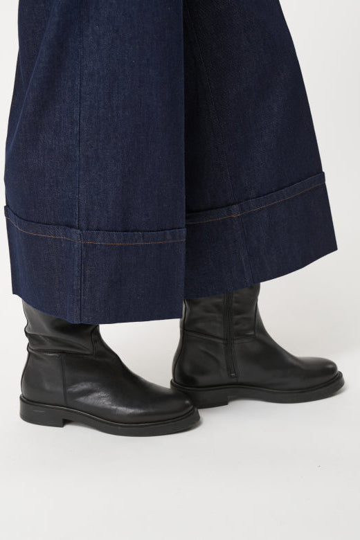 Make a statement with these wide-leg trousers in raw denim, featuring oversized lapels for a modern, tailored-inspired look. Cut at a chic 7/8th length, they offer a flattering silhouette, while the elasticated back waistband and belt ensure comfort and flexibility. Finished with a faux fly, these trousers combine contemporary design with effortless ease—perfect for dressing up or keeping it casual.