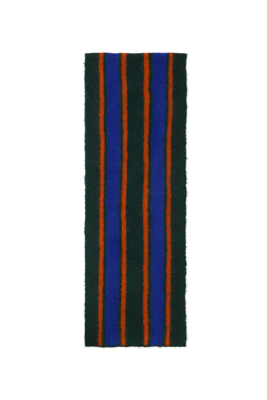 Crafted from a soft alpaca blend, this striped scarf combines warmth with a lightweight, luxurious feel. Featuring bold stripes in shades of blue, orange, and dark green, it adds a vibrant touch to any autumn-winter look. Designed for versatile styling, it can be draped, wrapped, or knotted to bring both comfort and color to your everyday wardrobe.