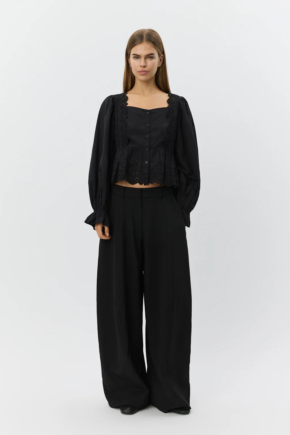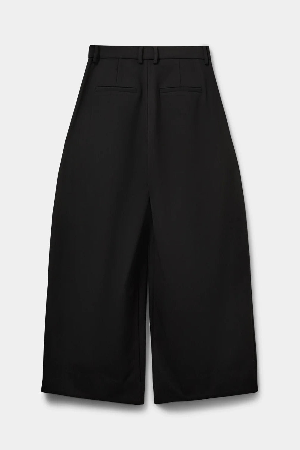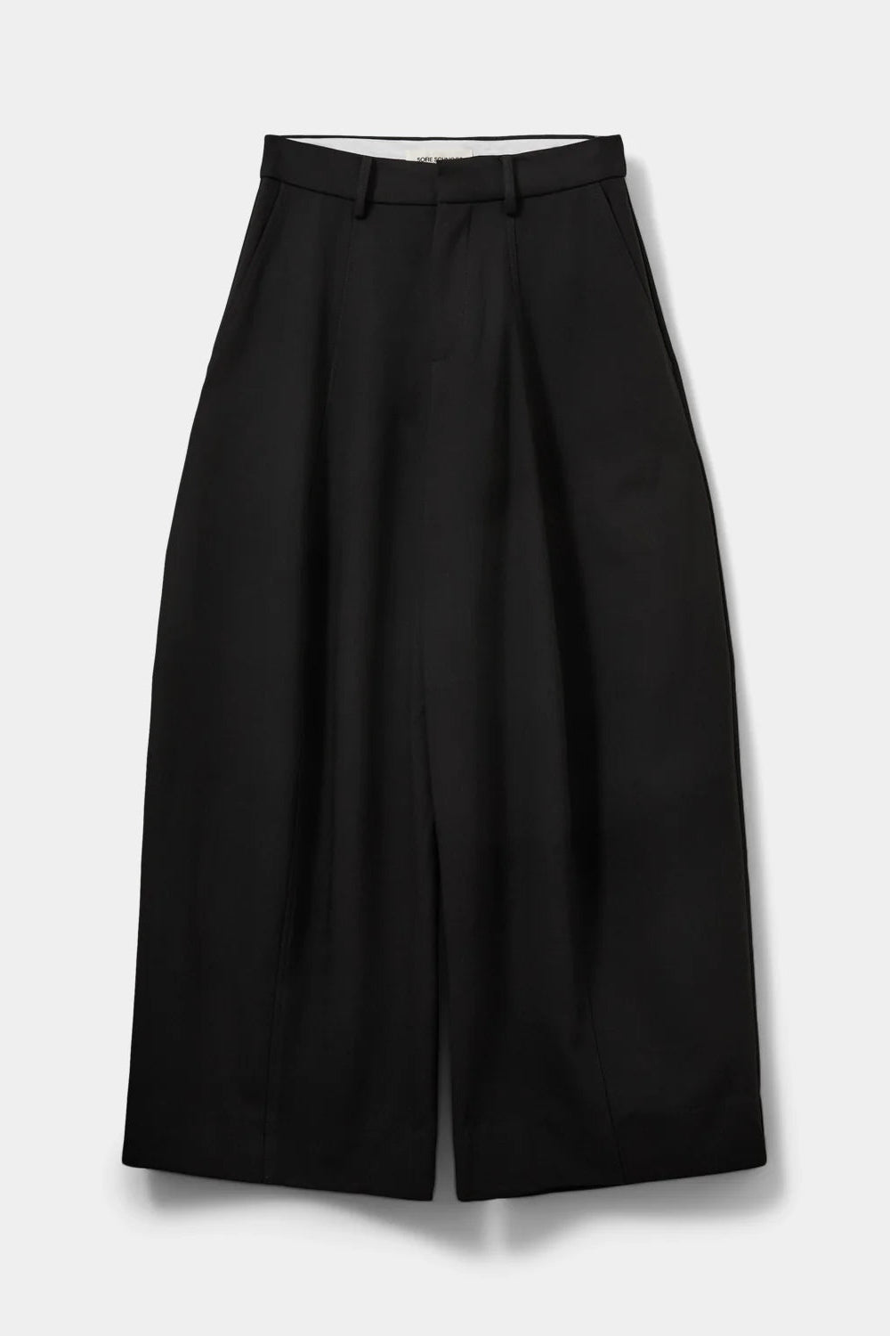 These high-waisted suiting trousers are cut in a wide-leg silhouette that elongates the frame while offering fluid movement. Front pleats add soft structure, while slanted pockets and belt loops bring classic tailoring details to this modern wardrobe staple. Polished yet versatile, they transition seamlessly from refined workwear to elevated everyday dressing.